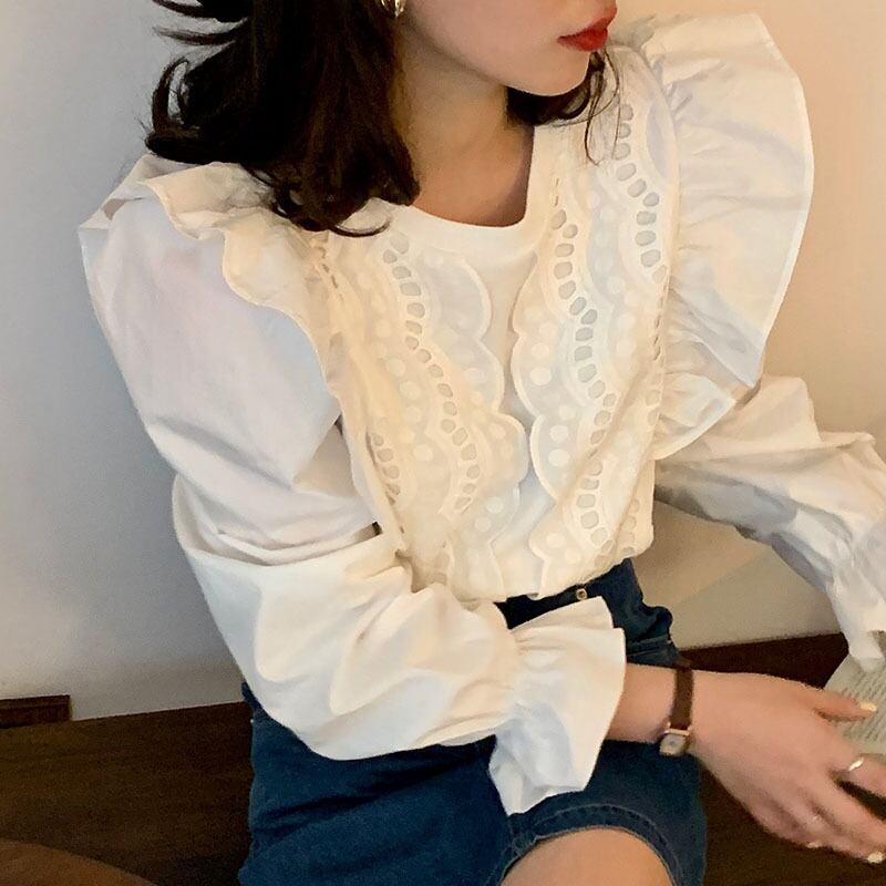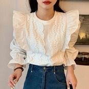 ノミクマスウィートOネックレースフックパッチワークフリルブラウスシャツカジュアルフレアスリーブレディーストップス2022Spring De ラッフル 大人ガーリー キュート スプリング 春物 kor6514598217