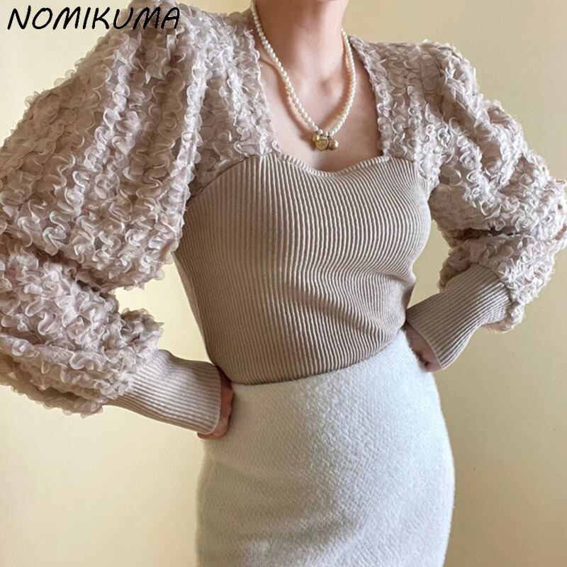 ノミクマ2022春のブラウス女性シックな3Dフラワーランタンスリーブパッチワークシャツスクエアカラースリム スプリング 春物 フラワーデザイン スクウェア kor24803677083