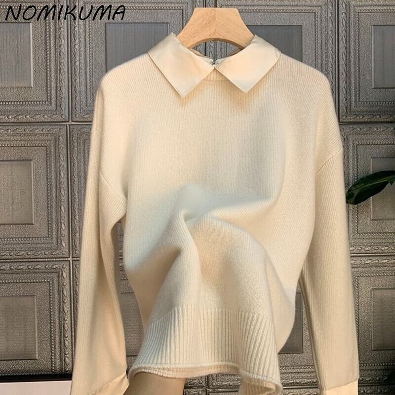 ノミクマターンダウンカラーニットトップス長袖レディースプルオーバー2021秋冬ニットセーター6Q104 ロング オータム 秋物 ウィンター 冬物 kor11409974307