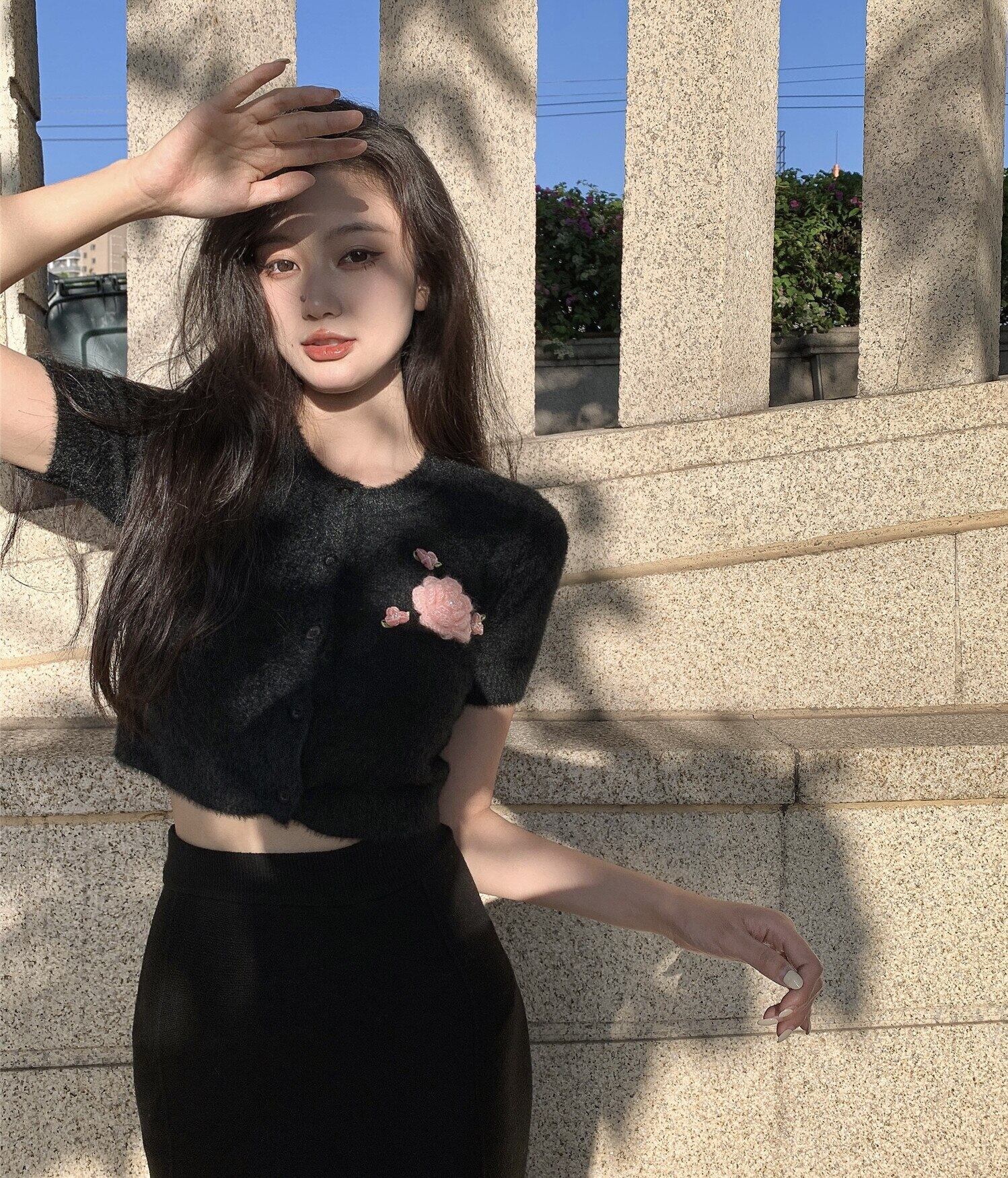 のみくまシック刺繍フローラル半袖ニットカーディガン女性2022年春モヘアクロップショートニットコート ハーフスリーブ スプリング 春物 花柄 kor60068225134