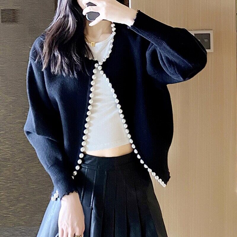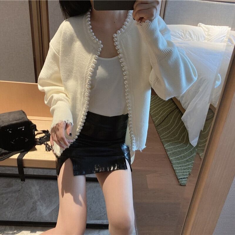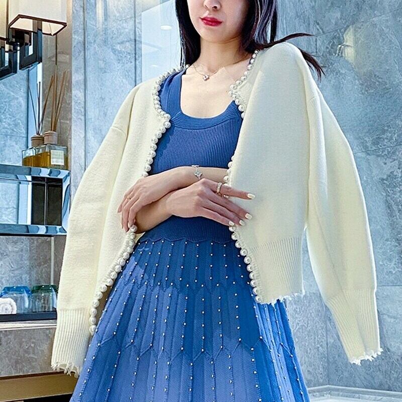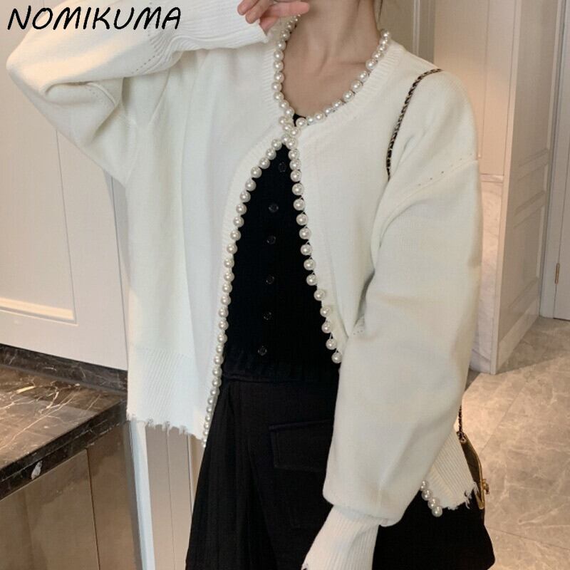 のみくま2021Oネックビーズカーディガンセーター因果長袖レディースニットコートオープンステッチ6V131 ロング kor66499306778