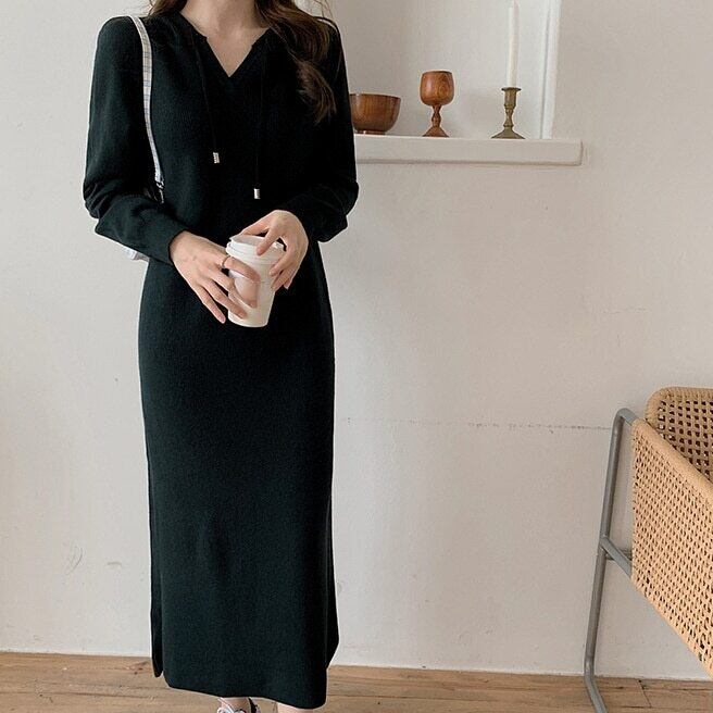 秋冬ニットドレス女性長袖ドローストリングフード付きセータードレス ロング オータム 秋物 ウィンター 冬物 kor18493721426