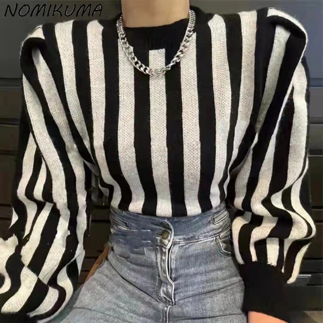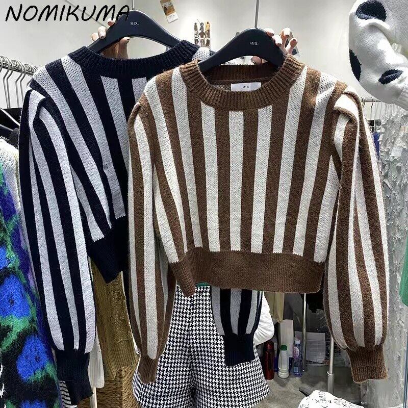 ノミクマシックコントラストカラーストライプニットセーター秋冬スリムウエストショートニット2021プルオーバートップ6X920 オータム 秋物 ウィンター 冬物 kor94451491175