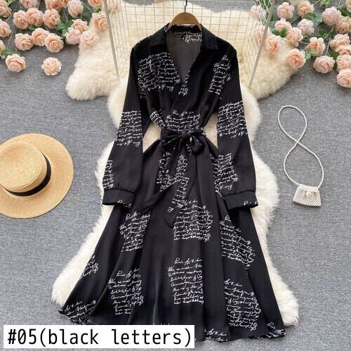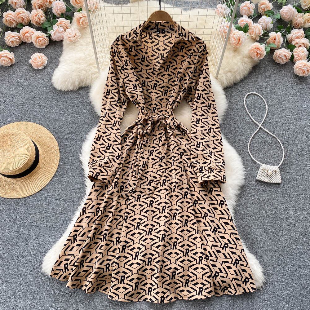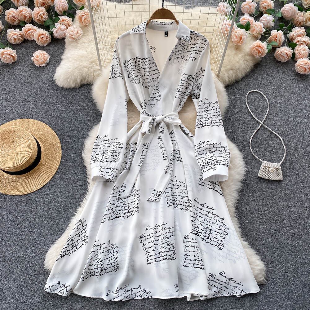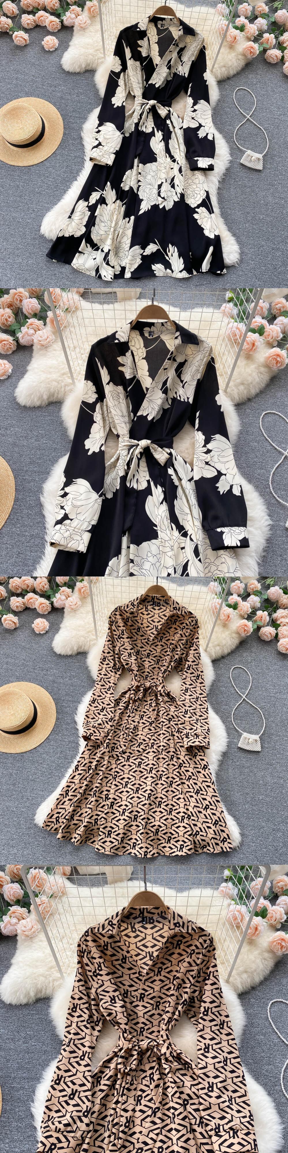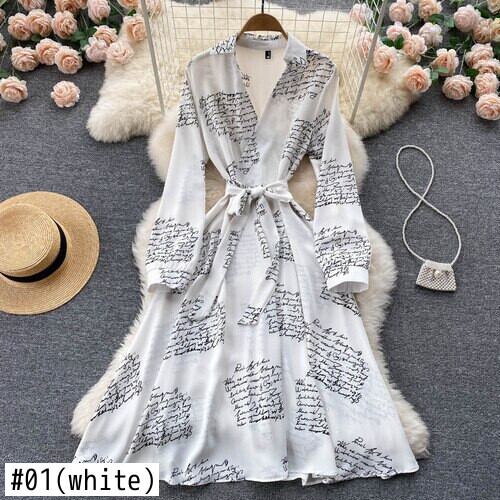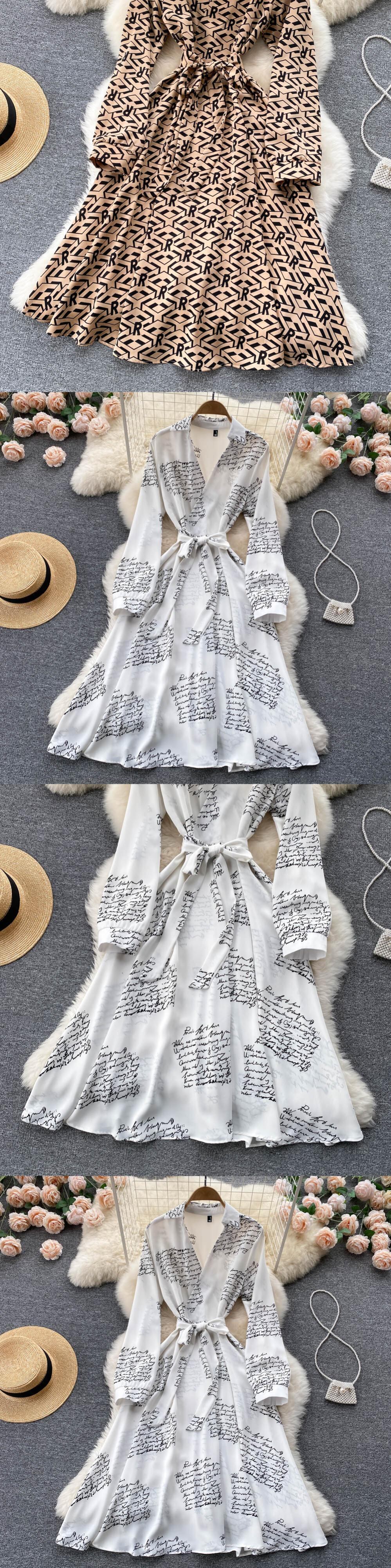 のみくまプリンティングウーマンドレスボウ包帯スリムウエスト春長袖Vネックワンピース ロング リボン スプリング 春物 kor56091327830