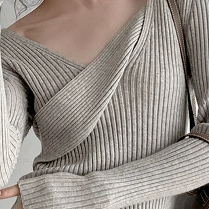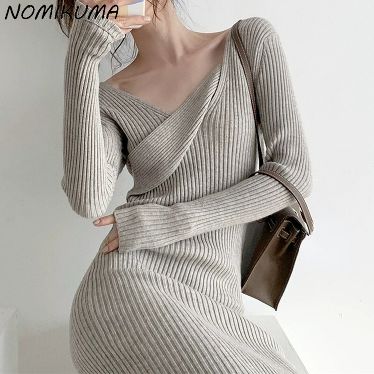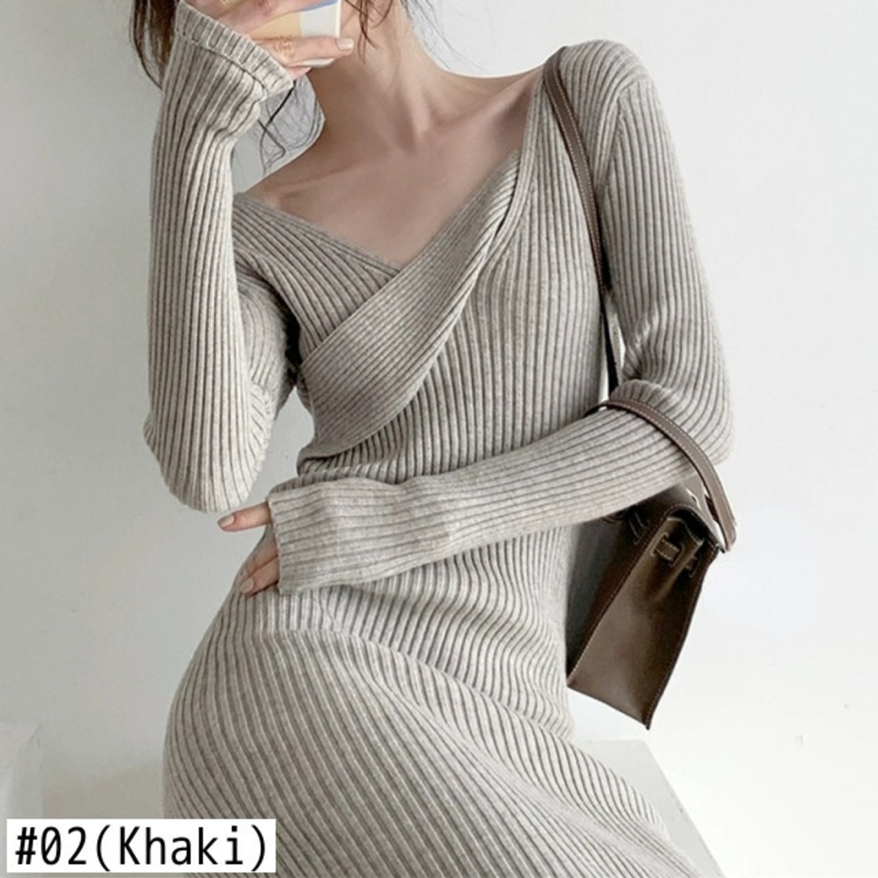 のみくまニットドレス女性2021年秋冬ベーシックセータードレス長袖Vネックスリムストレッチボディコーン ロング オータム 秋物 ウィンター 冬物 kor5303730324