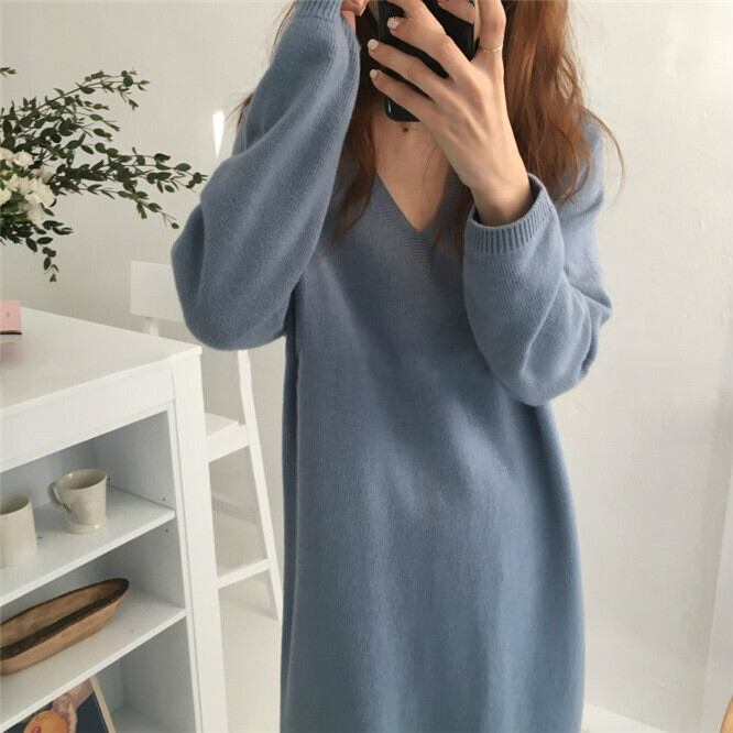のみくま因果ソリッドレディースセータードレス長袖Vネックニットワンピース2020秋冬ストレート ロング オータム 秋物 ウィンター 冬物 ソリッドカラー kor3282408497