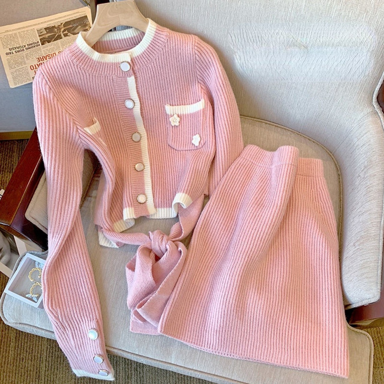 のみくまニットレディースセット蝶ネクタイ長袖Oネックニットトップス+ウエストAラインミニスカート2枚スーツ6N642 ロング リボン kor15477650696