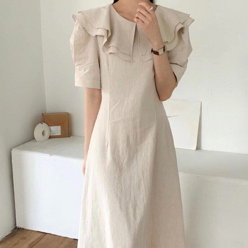 ノミクマシックダブルフリルピーターパンカラードレスパフスリーブレースアップスリムウエストウーマンドレス6L021 kor11417954673