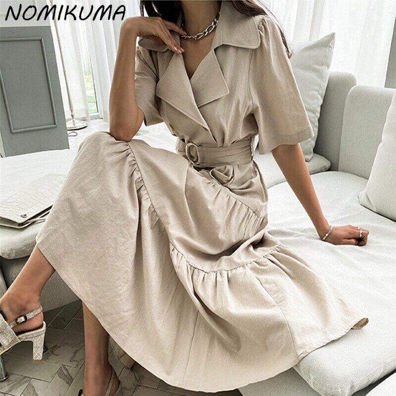 のみくまダブルブレストウーマンワンピース半袖ノッチカラーベルトスリムウエストワンピース6L037 ショート ハーフスリーブ ドレス ハーネス kor83028265101
