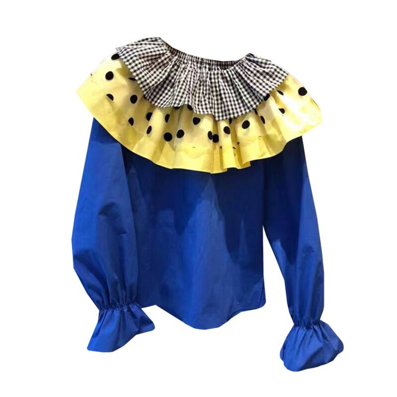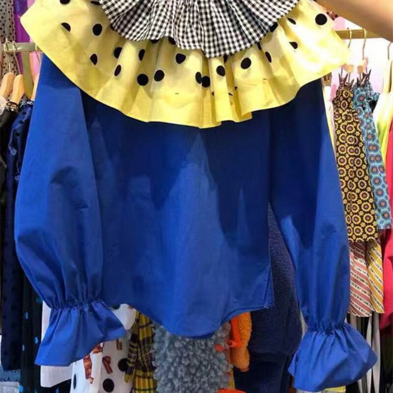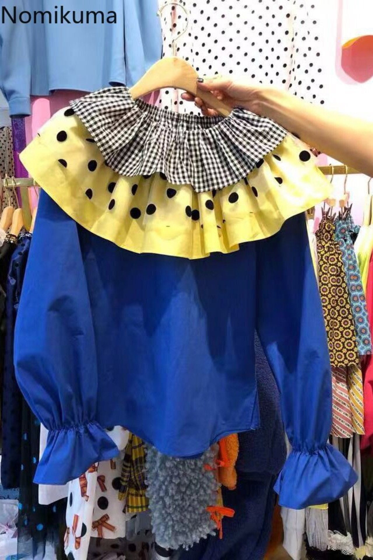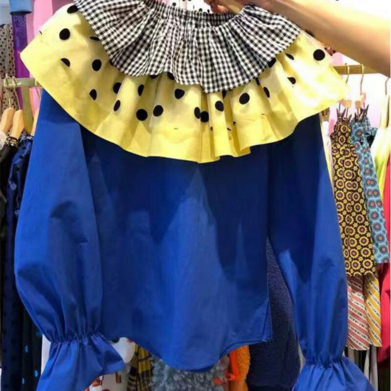 ノミクマ2021春の女性ブラウスチェック柄ドットダブルフリルOネックトップシャツカジュアルフレアスリーブスウィート6F286 大人ガーリー キュート スプリング 春物 kor38715111345