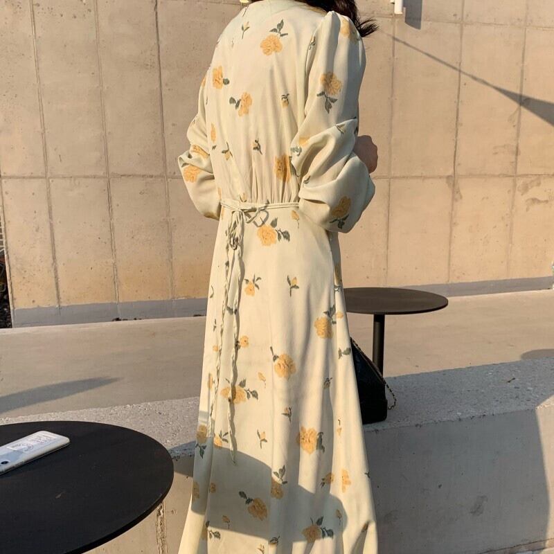 のみくまシック秋プリントVネックワンピースレディースパフスリーブスリムウエストワンピース6V326 オータム 秋物 ドレス kor40533227243