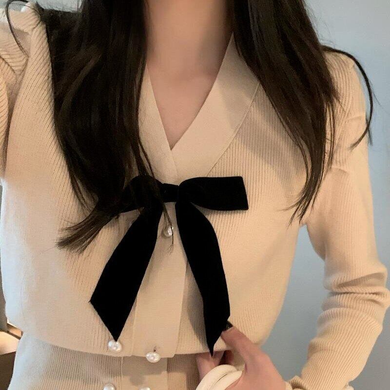 のみくまボウノットダブルブレストカーディガンニット長袖Vネックニットコート2021レディースセータートップス6N348 ロング リボン kor80090173590