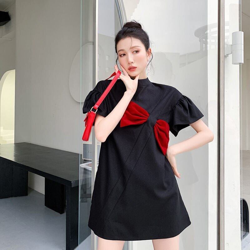 ノミクマウーマンスタンドネックドレス2021ボウノットスウィートドレスCausalButterflyスリーブVestidosDe 6K565 リボン 大人ガーリー キュート カジュアル kor83164266237