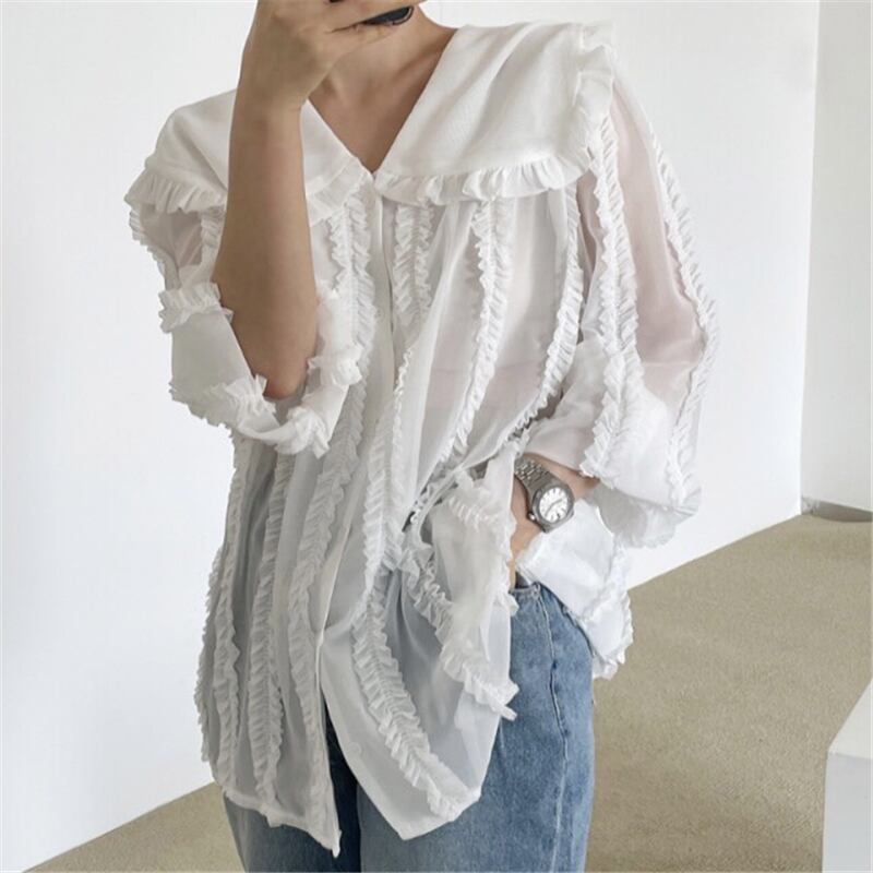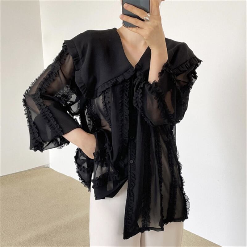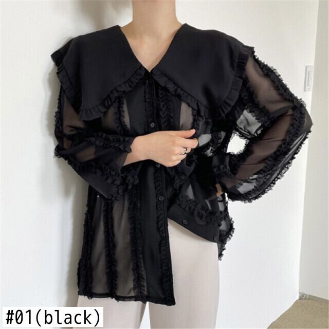 のみくまレースシャツレディースシックフリルパッチワークブラウスカジュアル長袖ピーターパンカラートップス2021年秋6L851 ロング オータム 秋物 kor89402981725