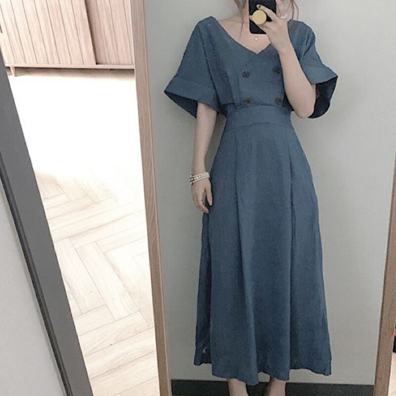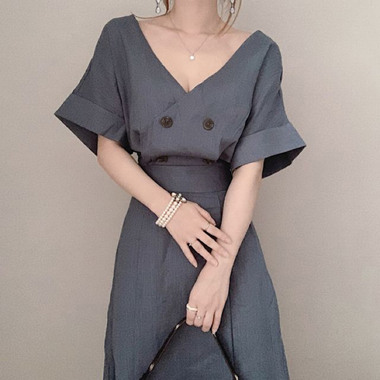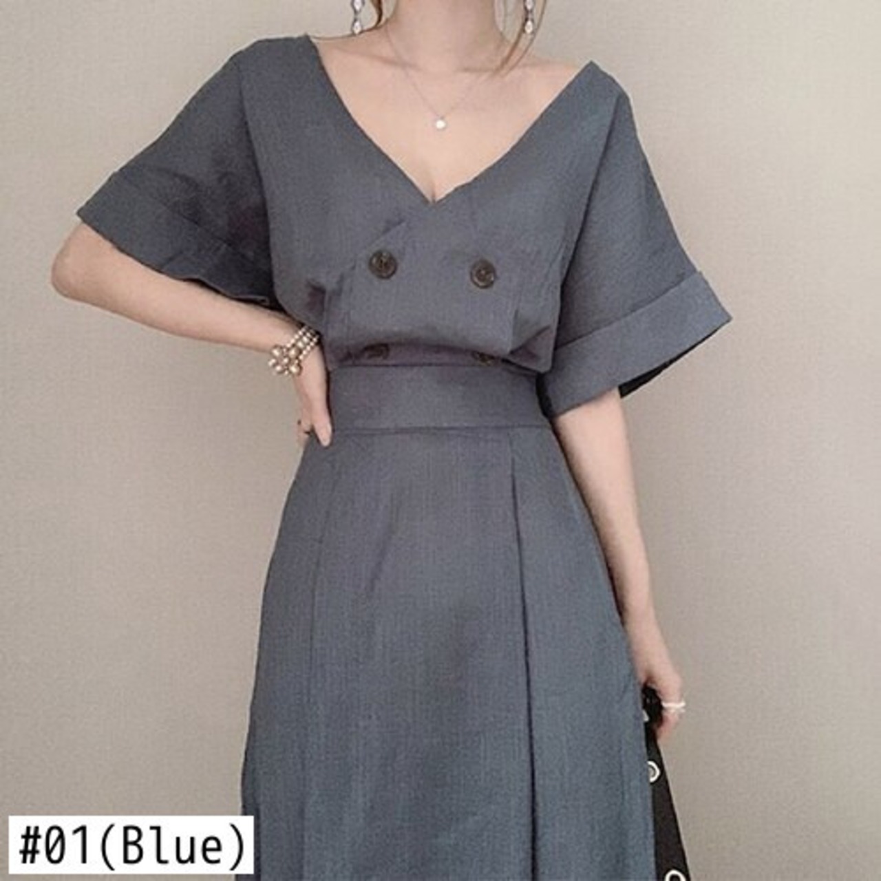 のみくまサマードレスレディースパフスリーブVネックワンピース2021ダブルブレストウエストAライン 夏物 kor69037923928