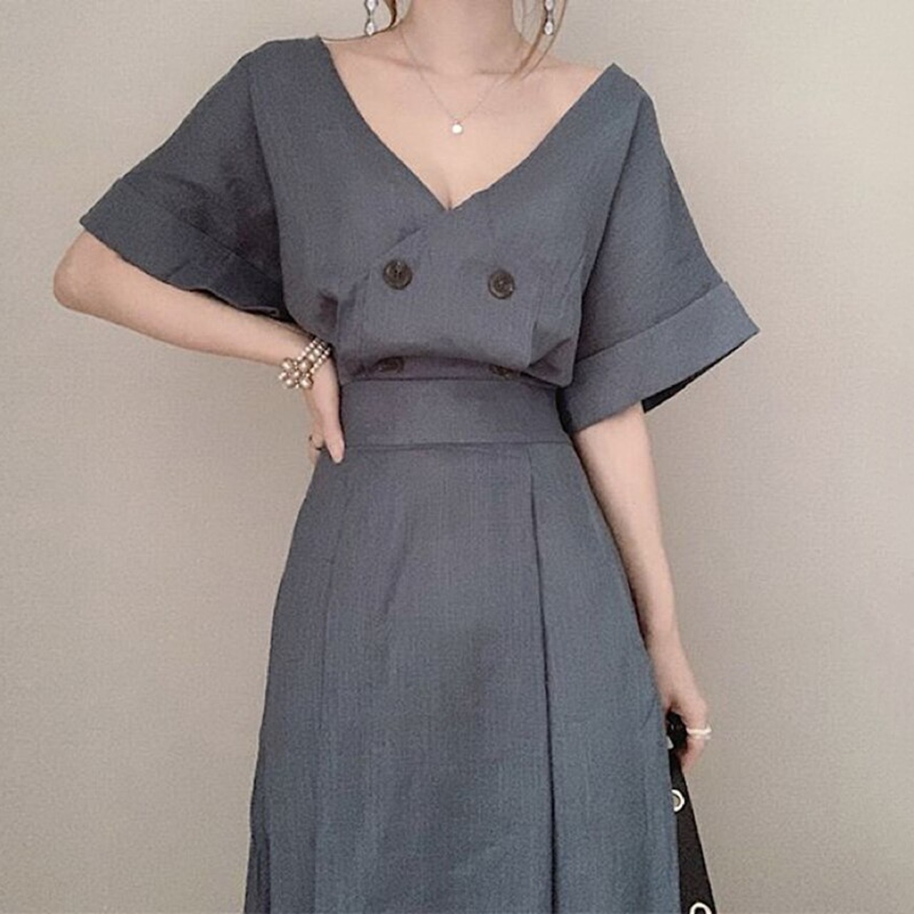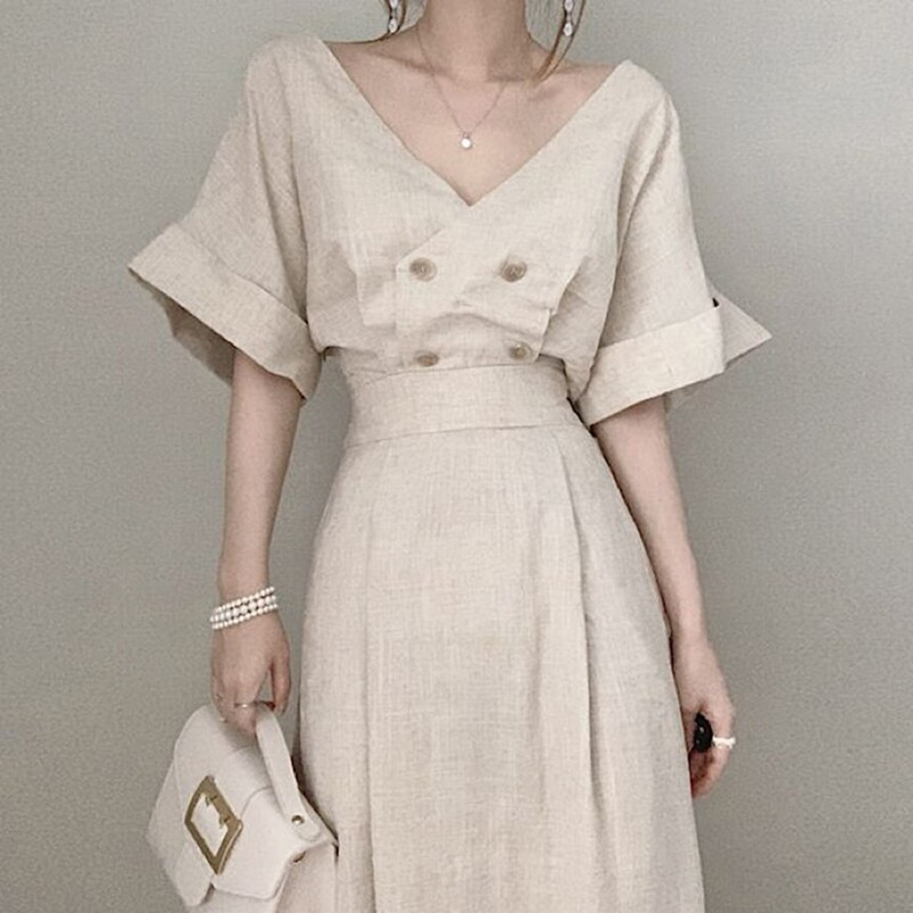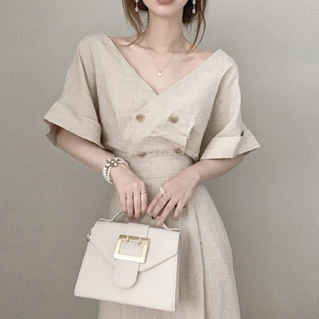 のみくまサマードレスレディースパフスリーブVネックワンピース2021ダブルブレストウエストAライン 夏物 kor69037923928