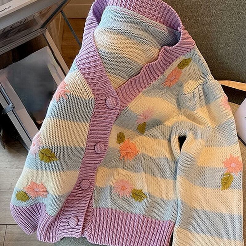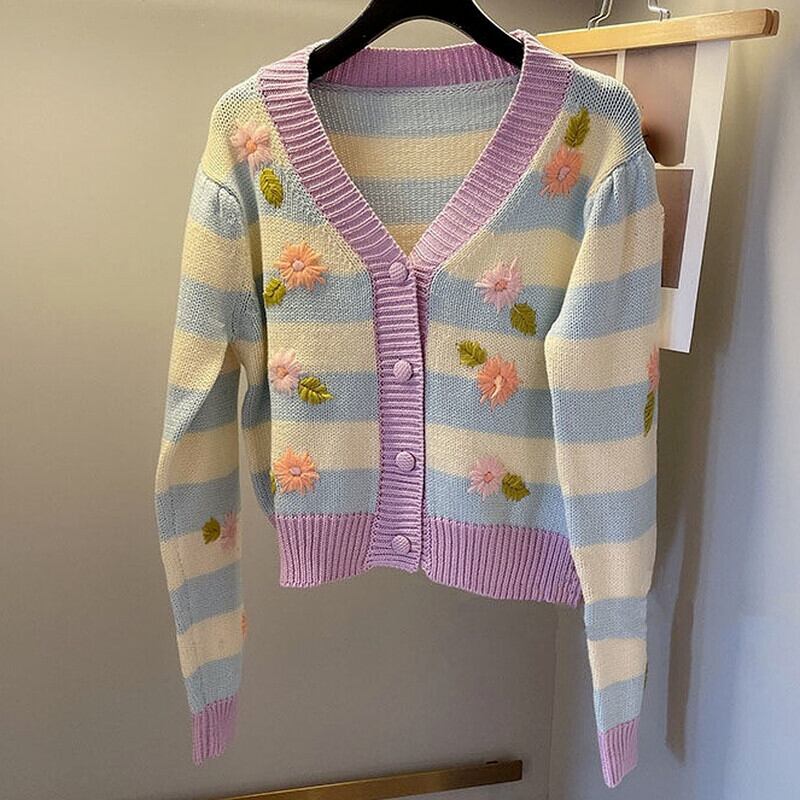 のみくまシックフローラル刺繡ヒットカラーショートニットカーディガン長袖Vネックセーター2021秋ニットコート6Z261 ロング 刺繍 オータム 秋物 花柄 kor10133483991