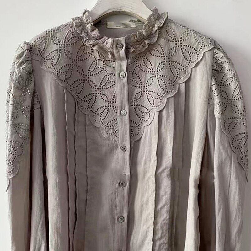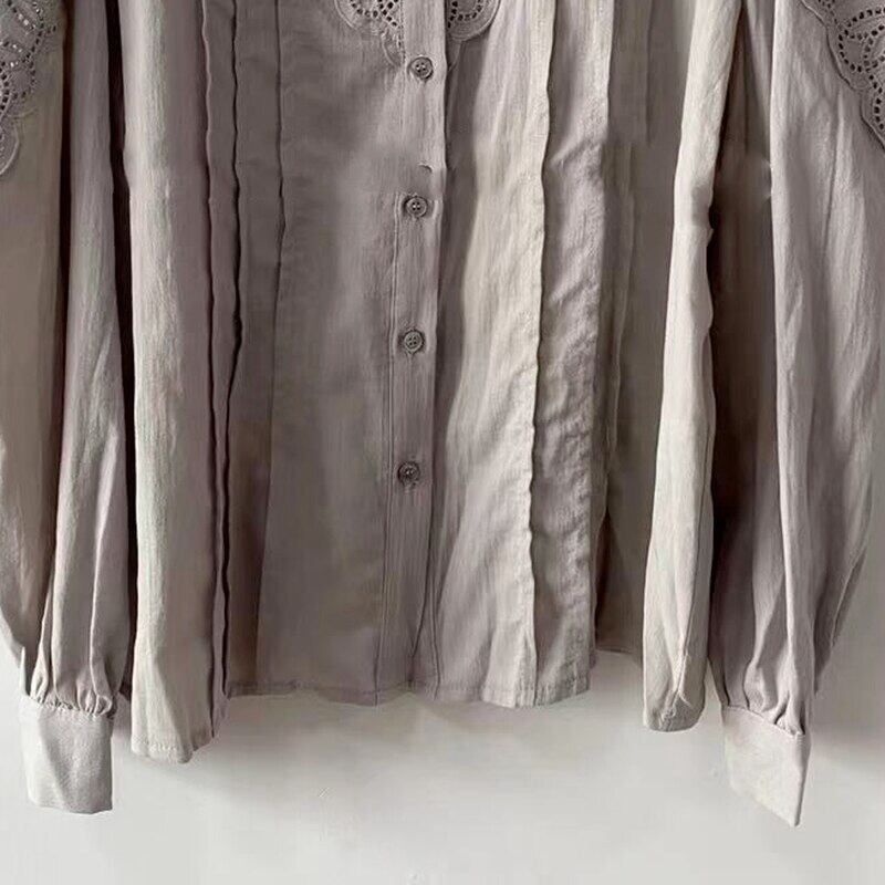 ノミクマホローアウトパッチワークレディースブラウス長袖Oネックトップシャツ2021秋ブルーサ6Z434 ロング オータム 秋物 kor56704760932