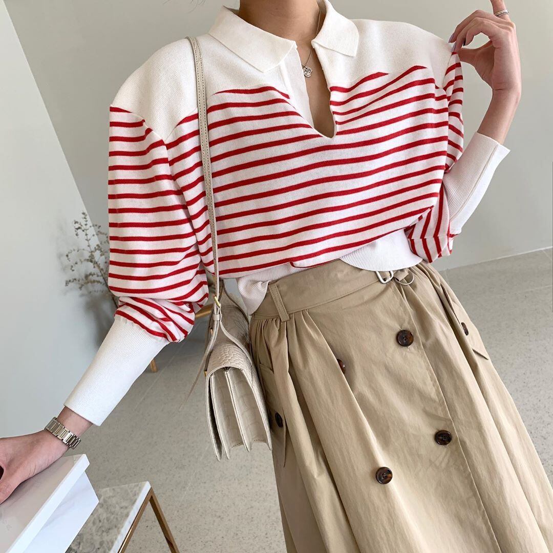 ノミクマヒットカラーストライププルオーバーセーターパフ長袖ターンダウンカラーニットトップスCausalWomen Knitwear 6C335 ロング kor92669097376