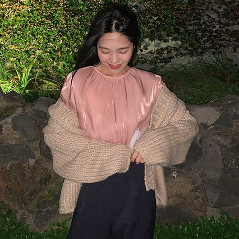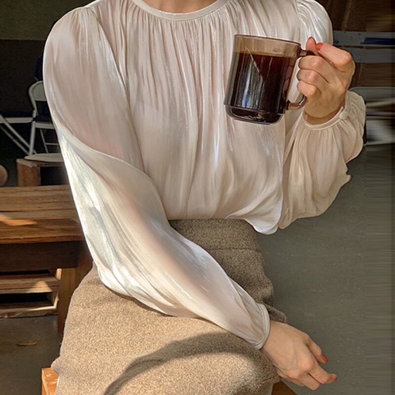 ノミクマプリーツOネックブラウスカジュアルソリッド長袖プルオーバートップス2020秋女性シャツ6D479 ロング オータム 秋物 ソリッドカラー kor14957507438