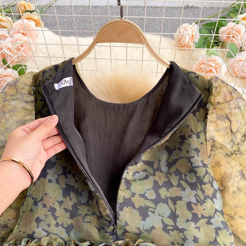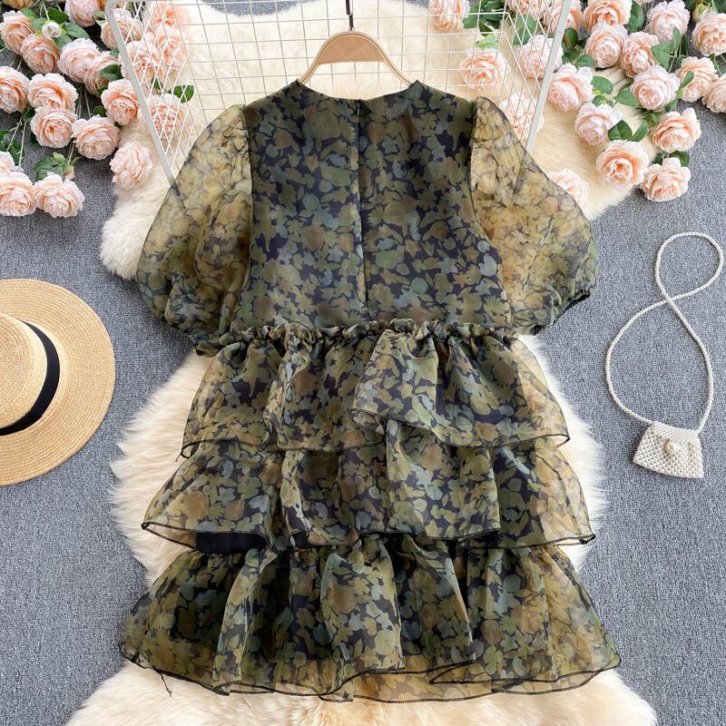 Nomikuma Vintage Printing Gauze Doll Dress Women Puff Sleeve O-neck Dresses Causal Sweet Layered-ruffle A-line 大人ガーリー スウィート キュート カジュアル ドレス Oネック Aライン ビンテージ kor64076514516