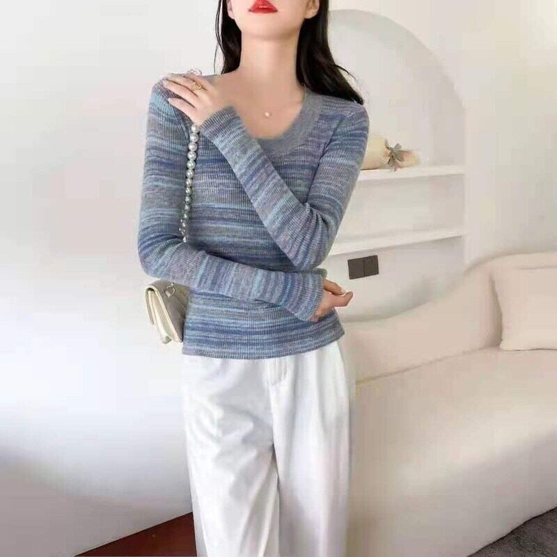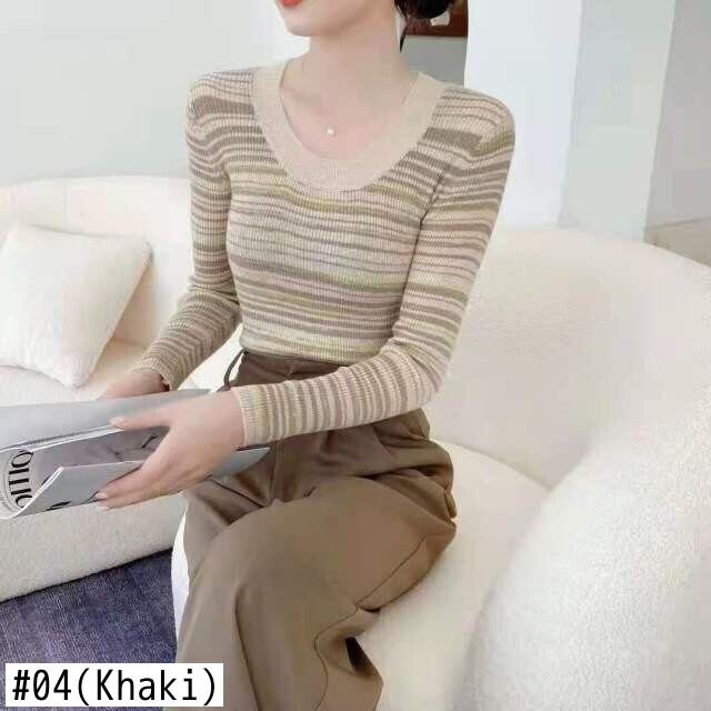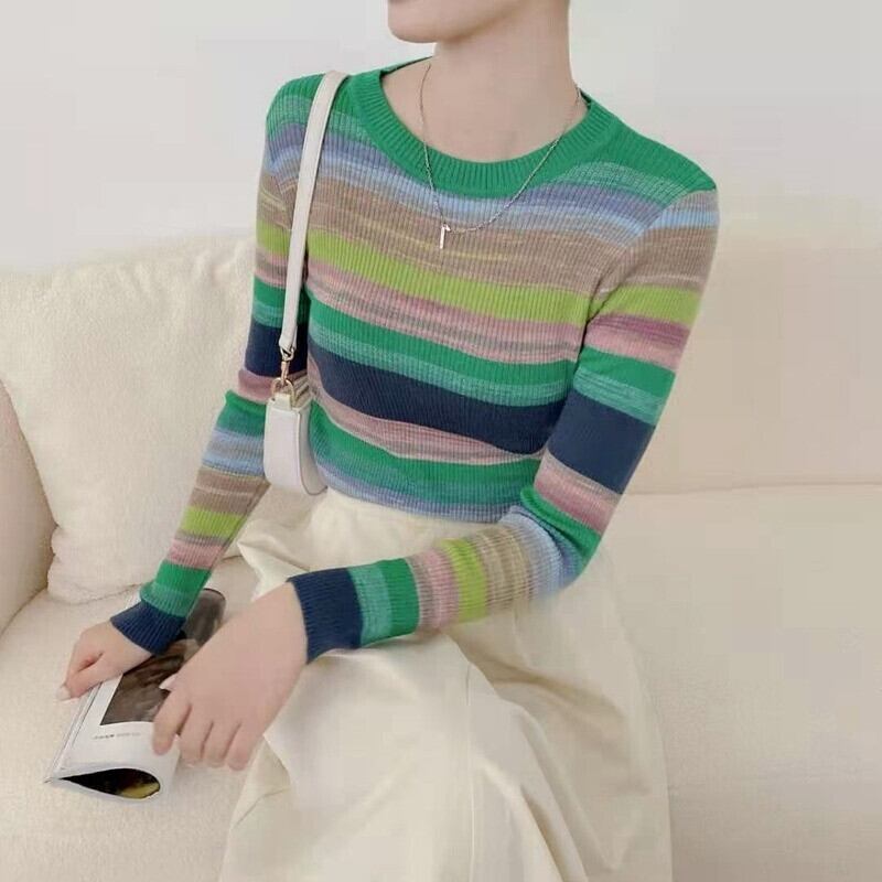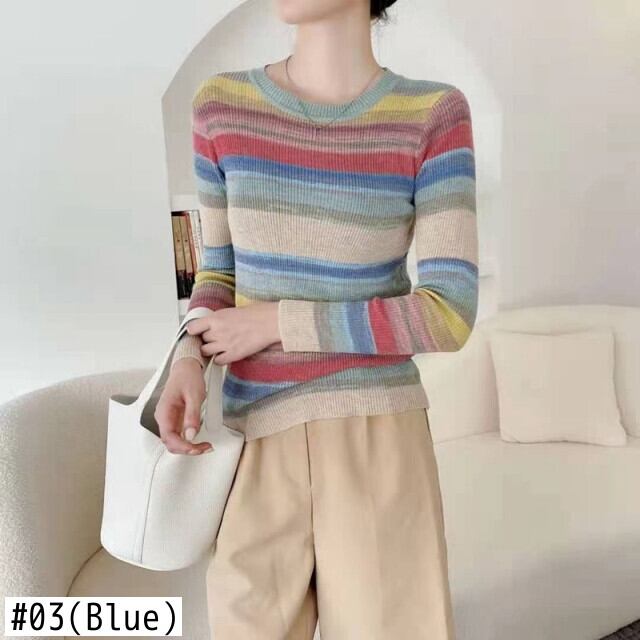 のみくまレインボーストライプスリムニットレディース長袖Oネック秋冬ベーシックニットトップ2021プルオーバーセーター6Z479 ロング オータム 秋物 ウィンター 冬物 kor53548501008