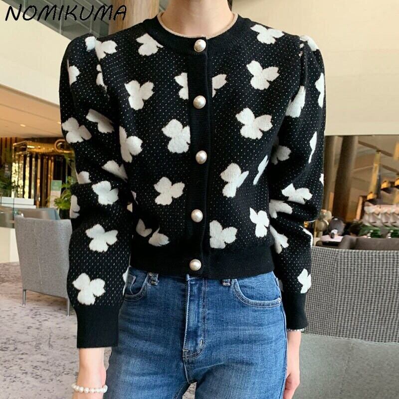 のみくまシックフラワーセーターコートパフスリーブOネックニットトップス2021秋女性ニットカーディガン6Z800 オータム 秋物 フラワーデザイン kor70797517748