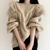 のみくまフェイクミンクカシミアパッチワークニットセーター中空ランタンスリーブカジュアルニットプルオーバー20216V210 ファー kor54062287374