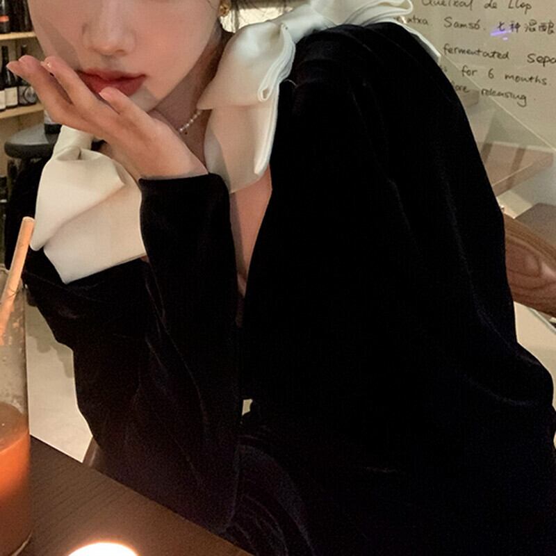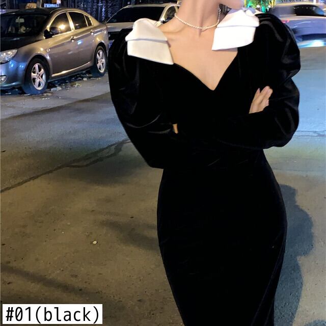 のみくまシックボウノットVネックベロアドレスレディース秋冬2021ロングボディコーンドレス長袖 リボン オータム 秋物 ウィンター 冬物 kor24435928014