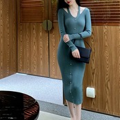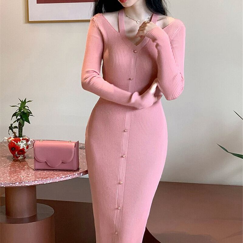 ノミクマニットボディコーンレディースドレスセクシーなVネック長袖セーター秋冬ベーシックドレス6N085 ロング オータム 秋物 ウィンター 冬物 kor42635868086