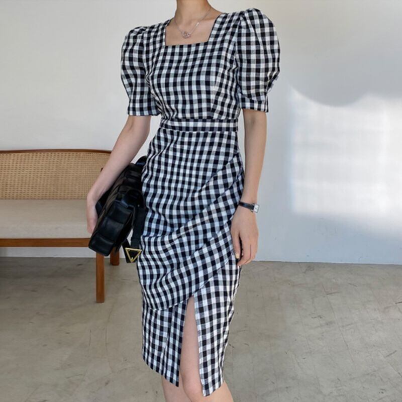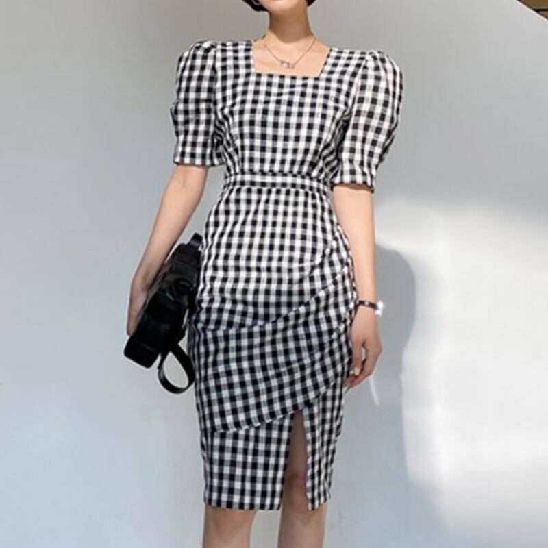 のみくまシックチェック柄ワンピースレディースパフ半袖スクエアカラーVestidoスリムウエストイレギュラーワンピース20216G791 ショート ハーフスリーブ ドレス スクウェア kor72589825389
