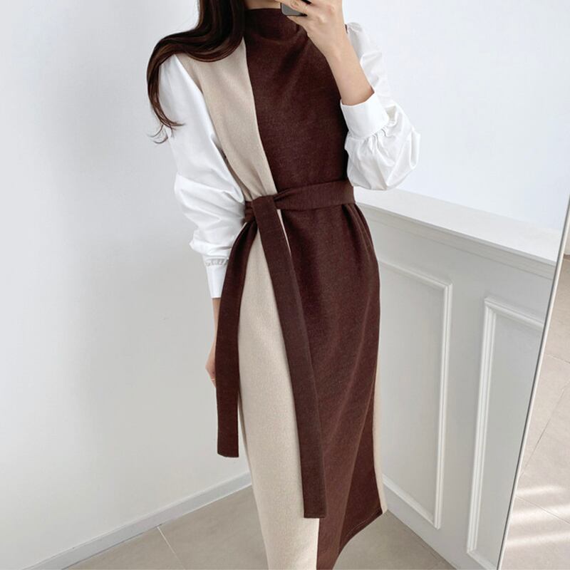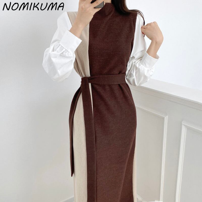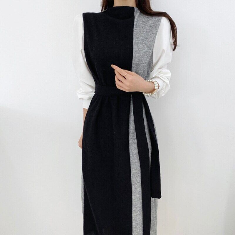 のみくまヒットカラーパッチワークニットワンピース女性包帯スリムウエストセーターVestidosパフスリーブスタンドネックワンピース6V413 ドレス kor76338743641