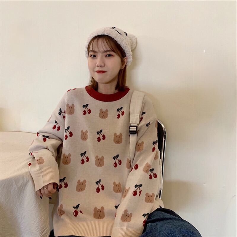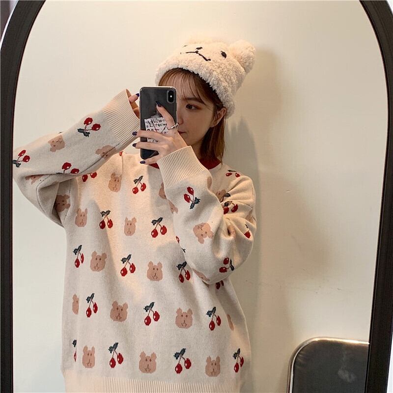 のみくまスウィートカートゥーンベアチェリーニットセーターカジュアル長袖Oネックニット2021秋冬プル6L190 ロング 大人ガーリー キュート オータム 秋物 ウィンター 冬物 kor51110684194