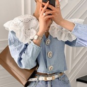 ノミクマレースヒットカラーパッチワークピーターパンカラージーンズブラウスコーザルショートウィメンズシャツ2021Spring Demin 6F646 スプリング 春物 kor9650168567