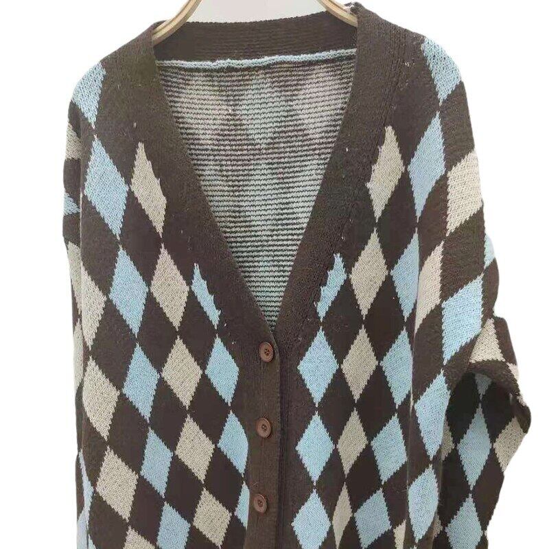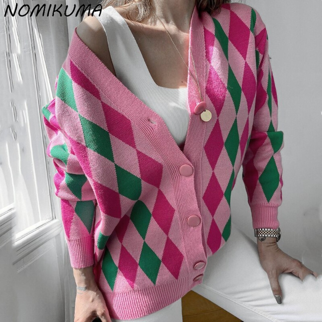 ノミクマ秋冬ニットカーディガンヒットカラーアーガイルセーターカジュアル長袖Vネックニットコート20216Z954 ロング オータム 秋物 ウィンター 冬物 kor65538351072