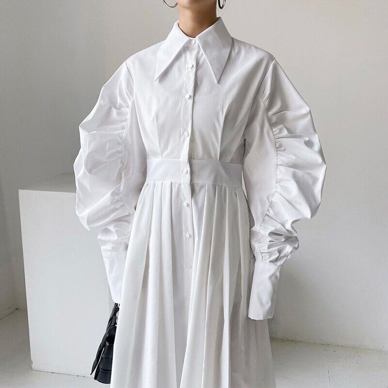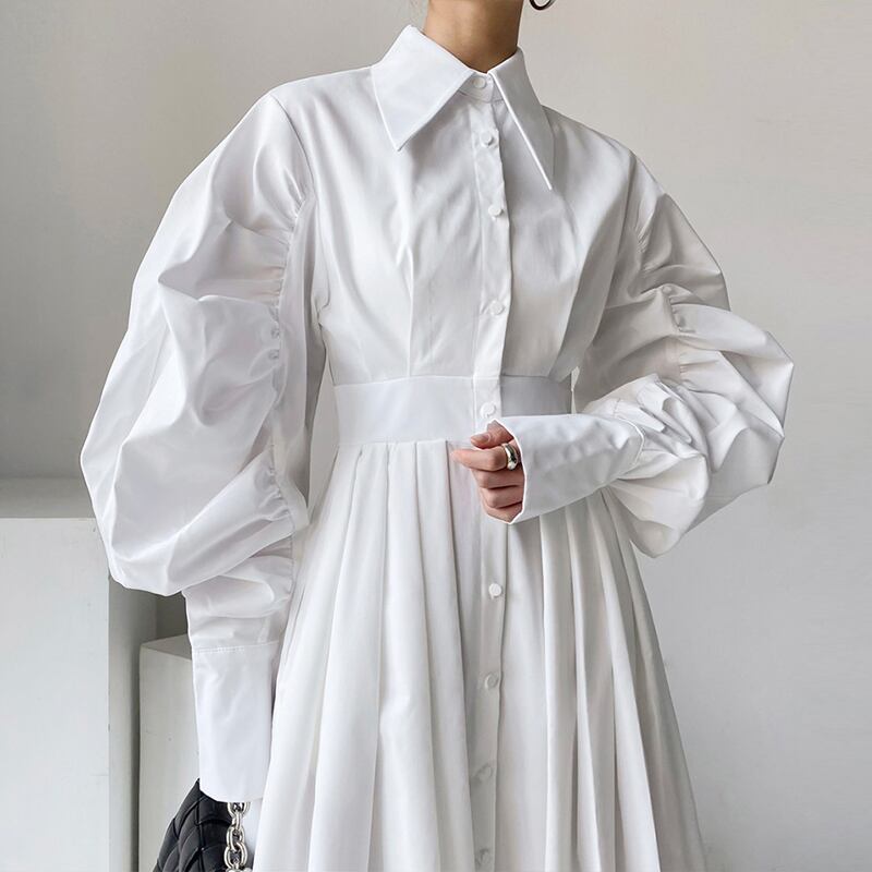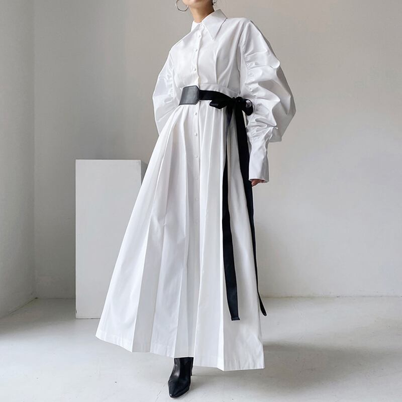 のみくまランタンスリーブレディースブラウスドレスシックな春のターンダウンカラードレスベルトスリムウエストVestidos スプリング 春物 ハーネス kor18773161784