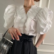 ノミクマプリーツフリルパッチワークVネックブラウスシャツシックパフスリーブレディーストップス20216K824 kor20609945520