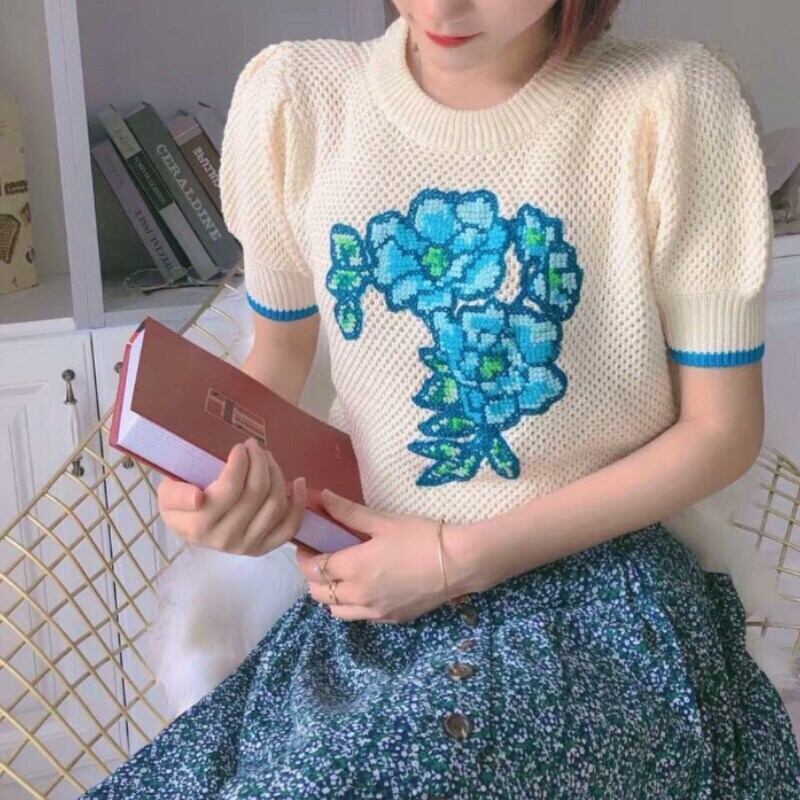 ノミクマ2021サマーパフスリーブニットフラワー刺繍OネックニットトップスCausalWomen Jumpers 6G768 夏物 フラワーデザイン kor52247346728