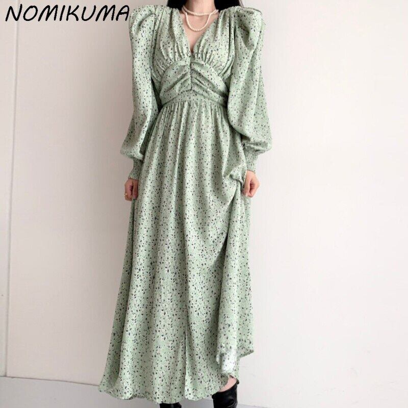 ノミクマフローラルドレスレディースパフスリーブVネックワンピースオータムスリムウエストスプリットヴェスティドス6Z183 秋物 花柄 kor82370024645