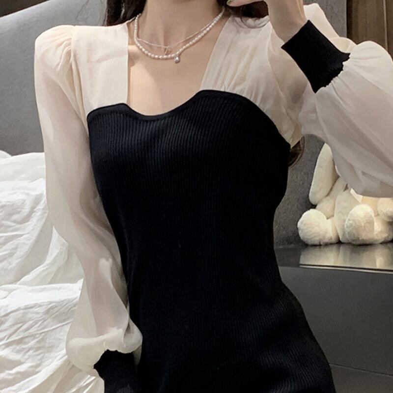 ノミクマヒットカラーニットパフスリーブドレス2021年秋ストレッチスリムボディコーンドレスレディースセーター オータム 秋物 kor98723956740