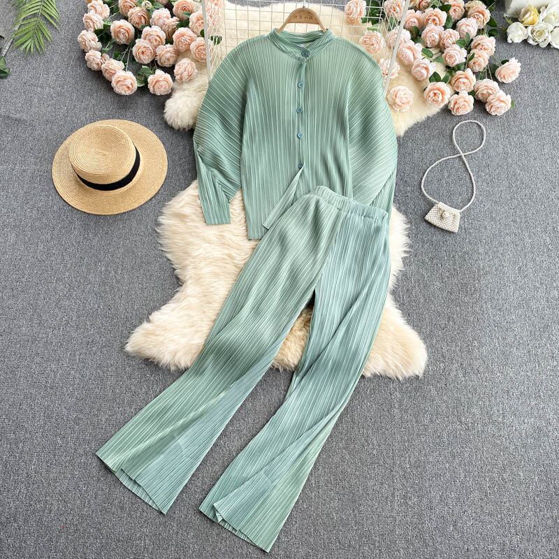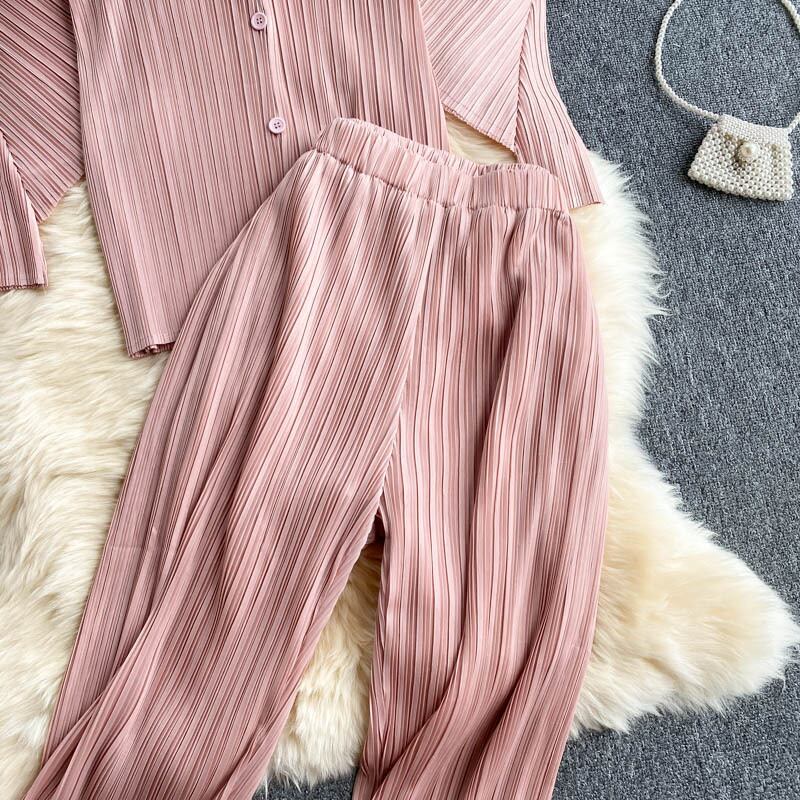 のみくまプリーツ2ピーススーツ長袖ブラウスシャツ+ウエストワイドレッグパンツCausalWomenパンツセット6K692 ロング ワイドパンツ kor97567488195