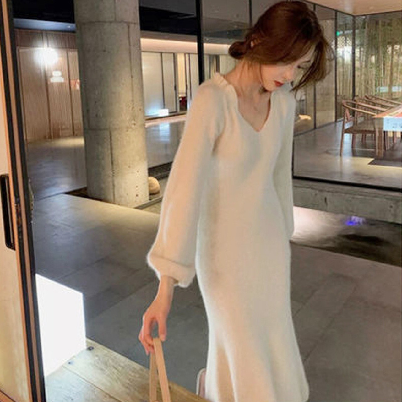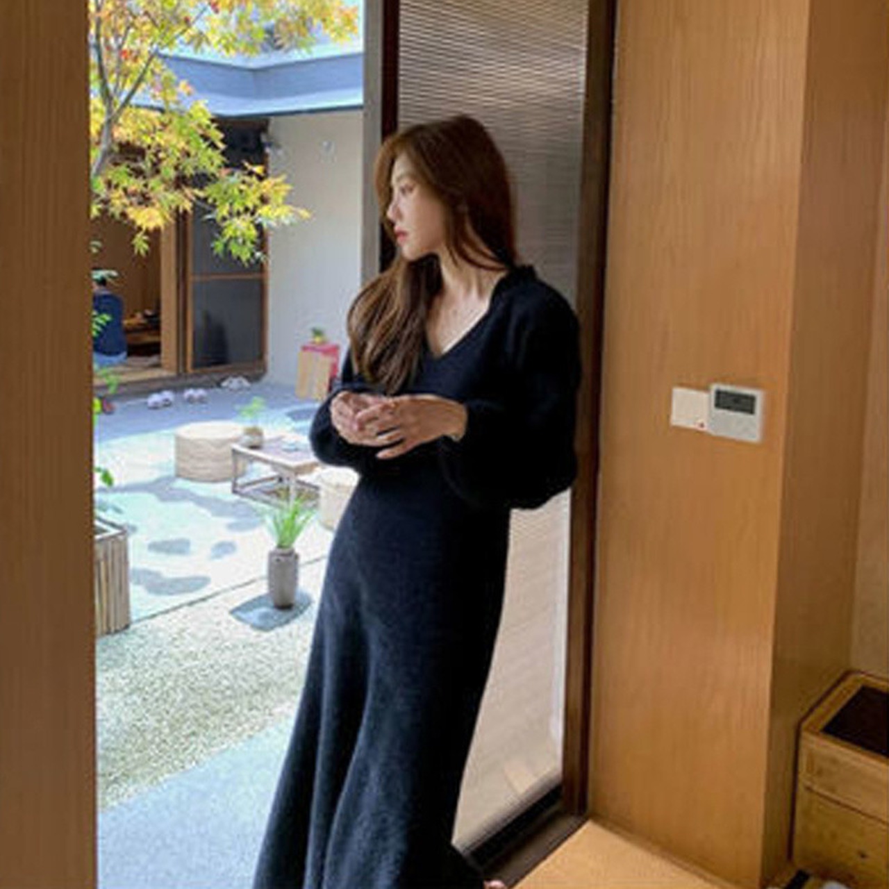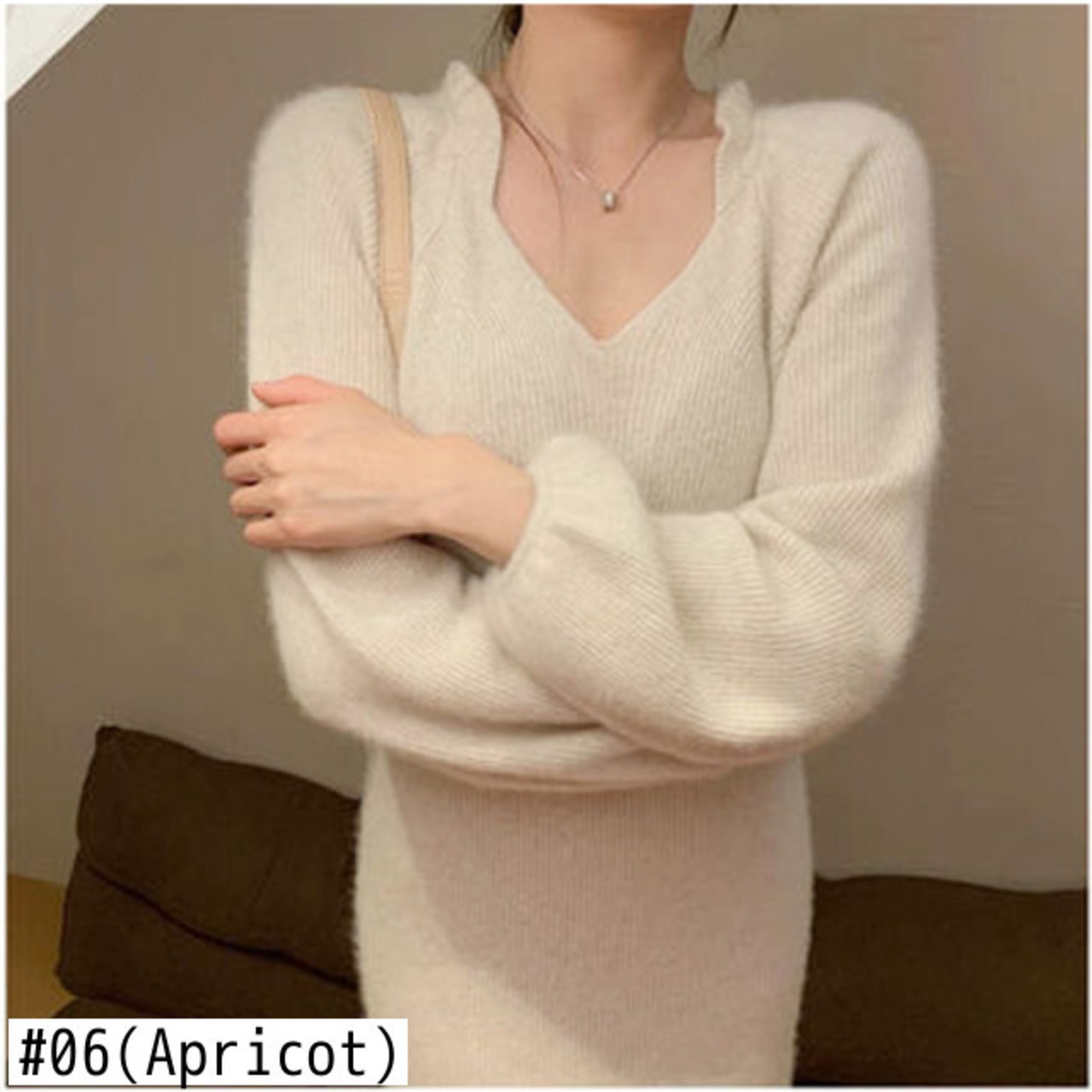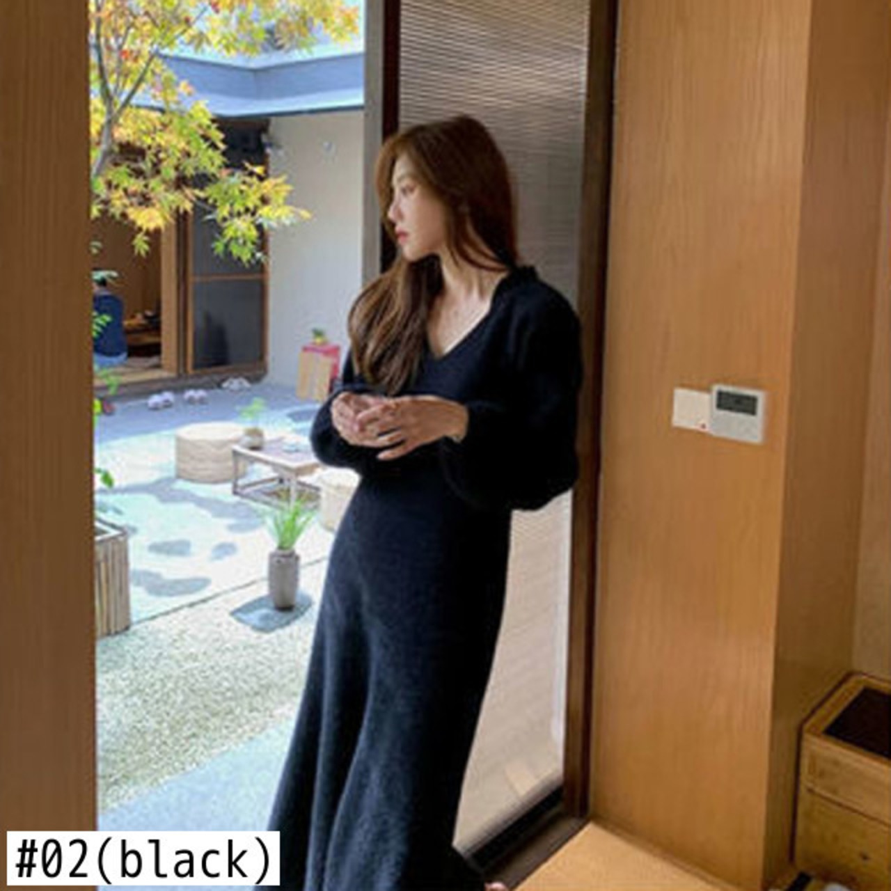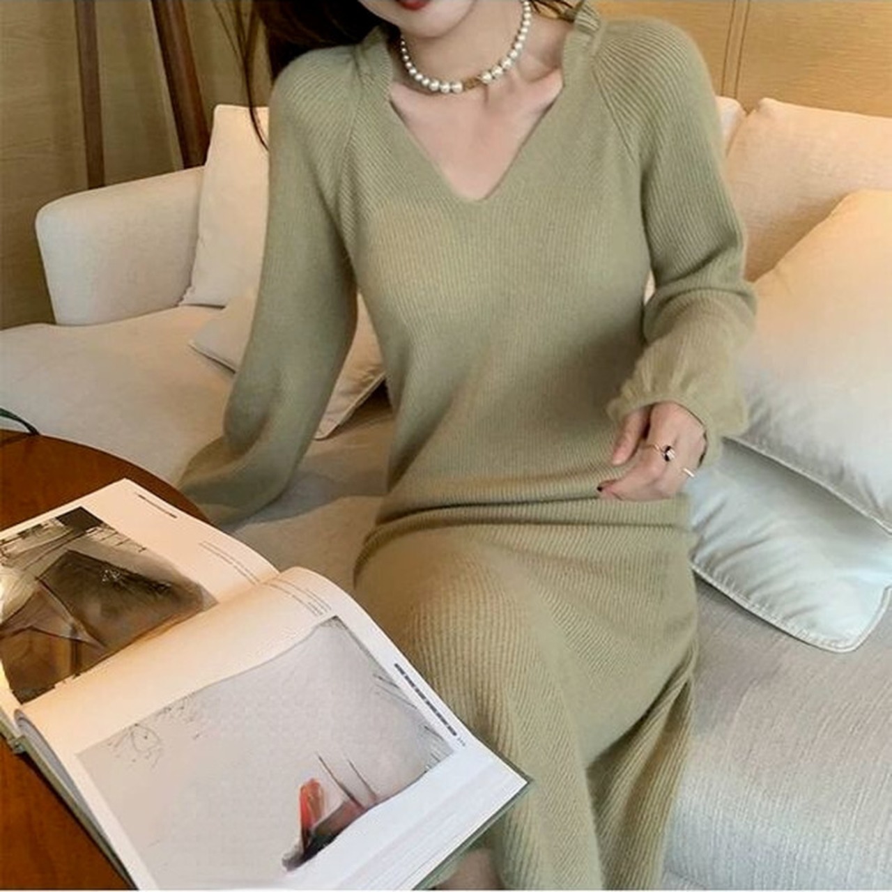 のみくま2021秋冬ベーシックニットワンピース長袖VネックVestidosレディースセーターワンピース6X317 ロング オータム 秋物 ウィンター 冬物 ドレス kor23872901766