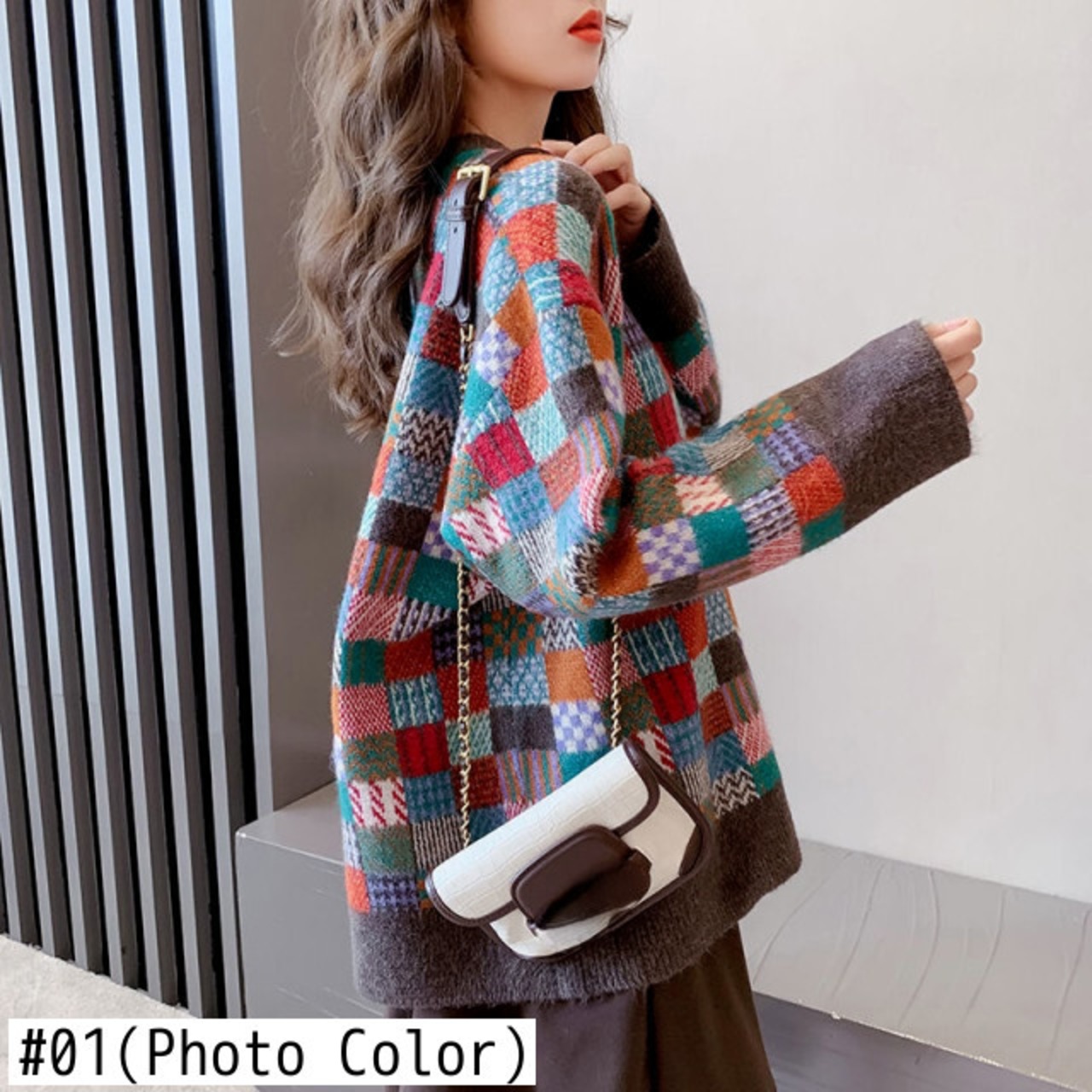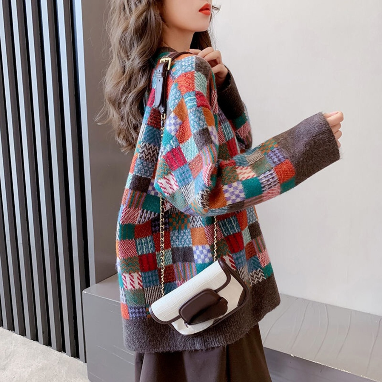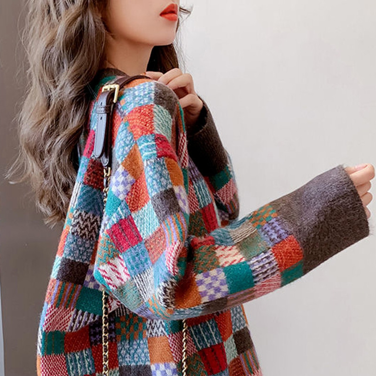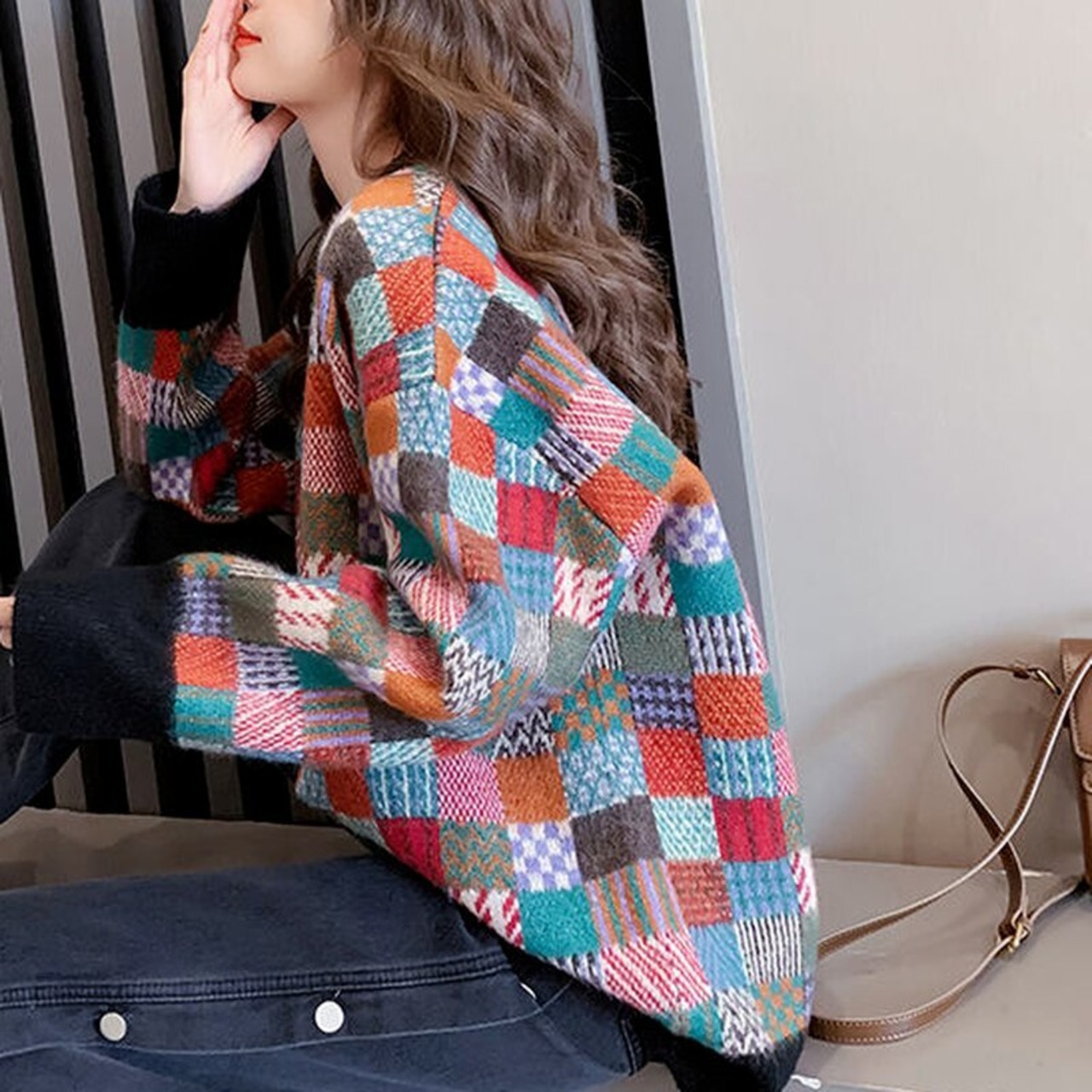 のみくま因果コントラストカラーチェック柄特大セーター長袖Oネックプル2021秋冬ニットプルオーバー6Z262 ロング オータム 秋物 ウィンター 冬物 kor77708687328
