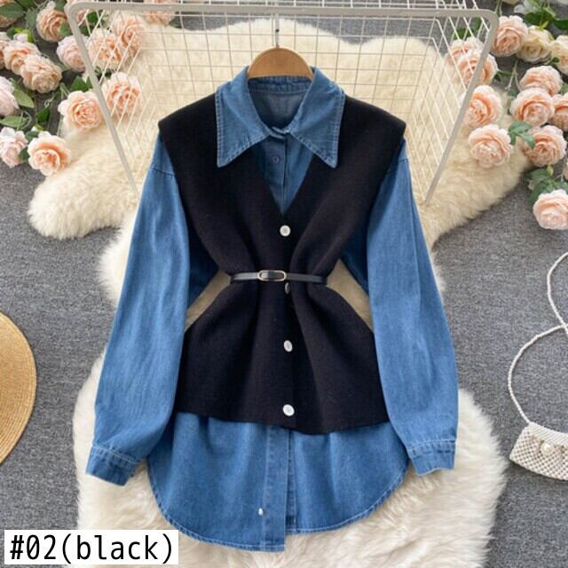 のみくま春ツーピースレディーストップスセットヴィンテージデミン長袖ブラウスシャツ+ニットカーディガンベストベルトスリムウエストスーツ ロング スプリング 春物 ハーネス ビンテージ kor26710625773
