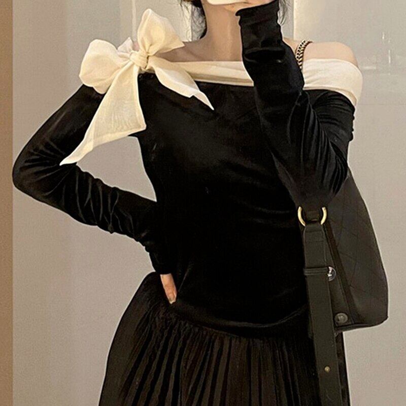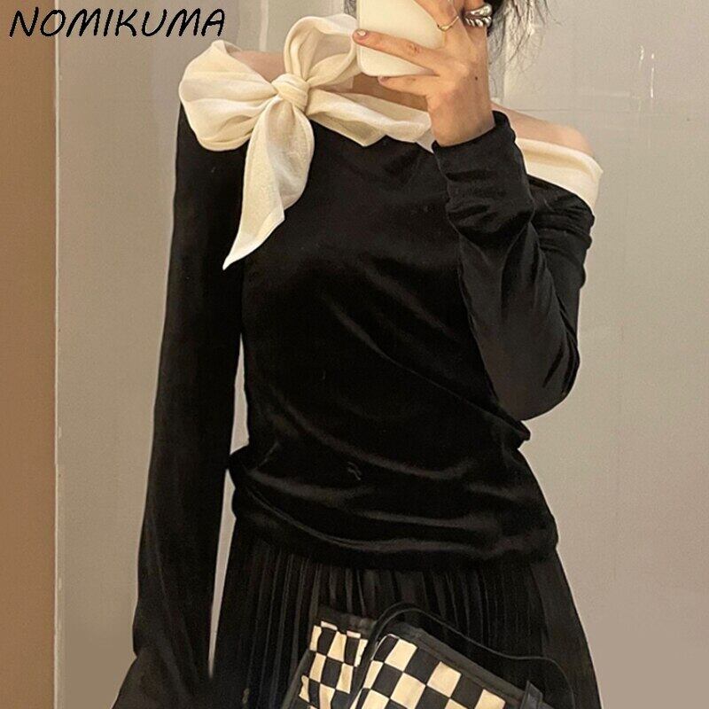 ノミクマオフショルダーストラップレスヒットカラー蝶ネクタイベロアシャツ女性長袖スリムブラウス2021フェミニマ6N403 ロング リボン kor36950329029