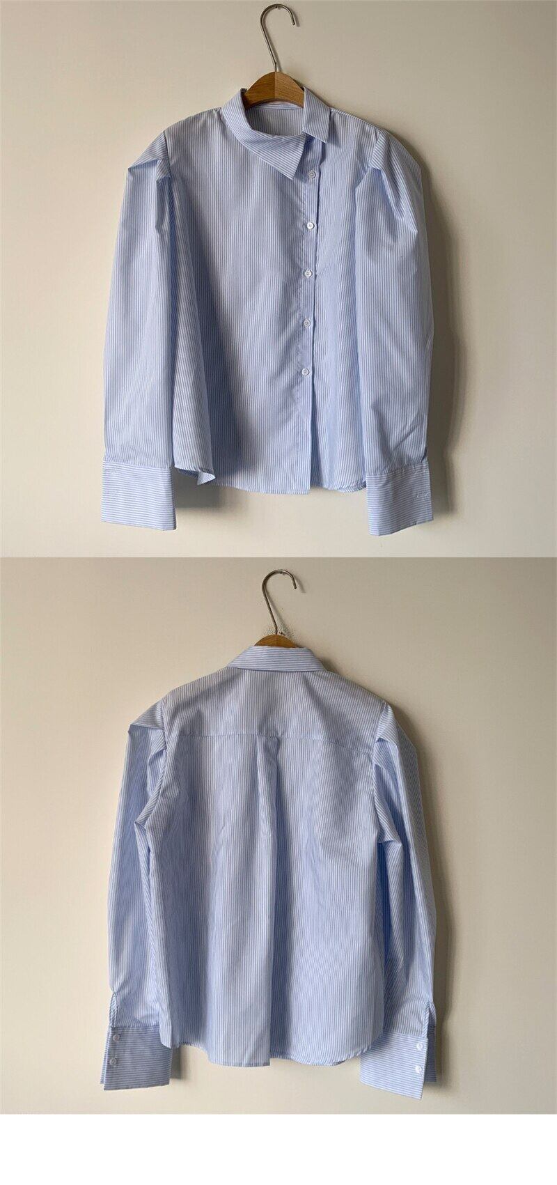 のみくまストライプレディースブラウスサイドシングルブレストターンダウンカラーシャツパフ長袖Causal2020 6B432 ロング kor98108030091