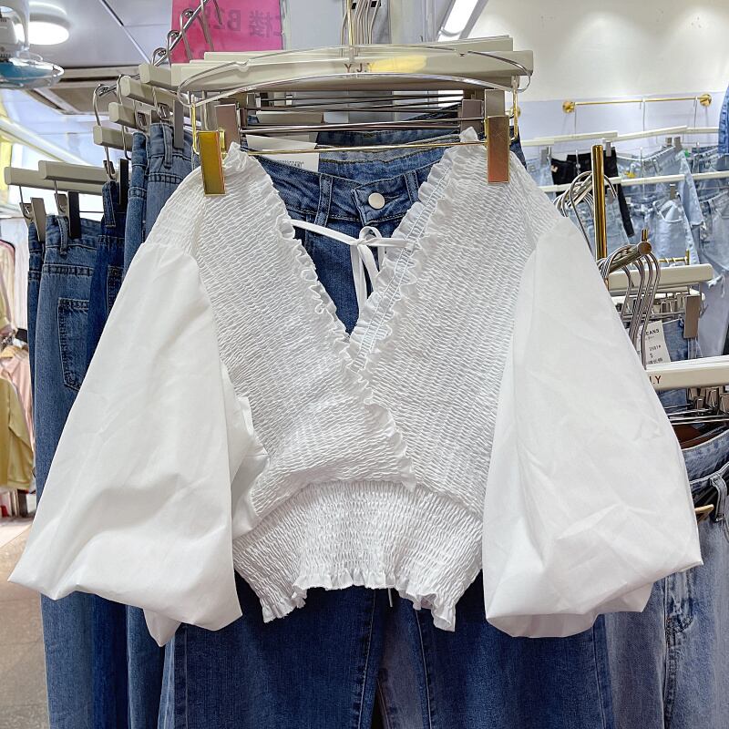 ノミクマ2022春夏ウーマントップスシックパフスリーブスウィートブラウスレースアップスラッシュネックシャツスリムショート 大人ガーリー キュート カジュアル スプリング 春物 サマー 夏物 kor64003271804