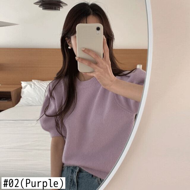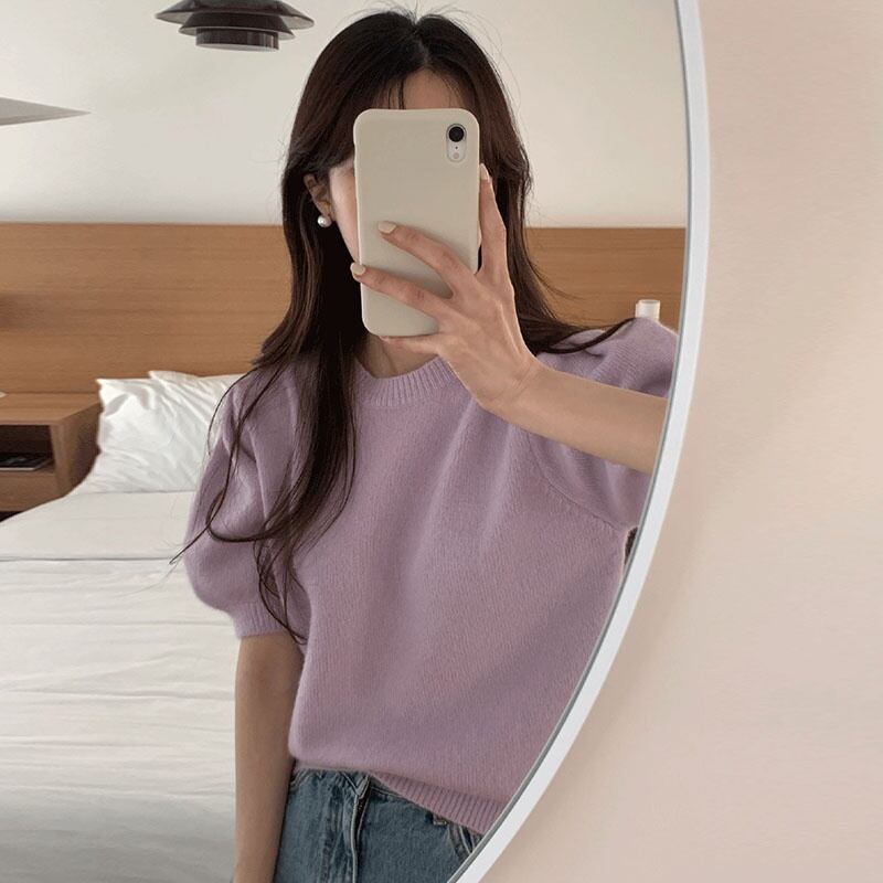 のみくまカジュアルパフスリーブレディースニットソリッドシックOネックプルオーバーニットトップス2022春夏セーター スプリング 春物 サマー 夏物 ソリッドカラー kor61683894619