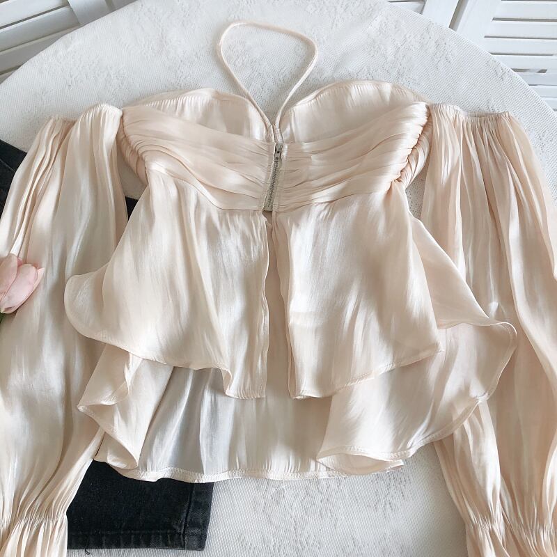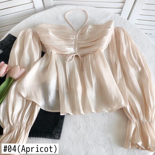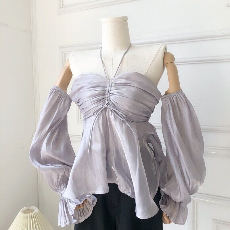 ノミクマセクシーホルターオフショルダーブラウスシャツドローストリングフォールドレディーストップスリムウエストフレアスリーブ kor76441033288
