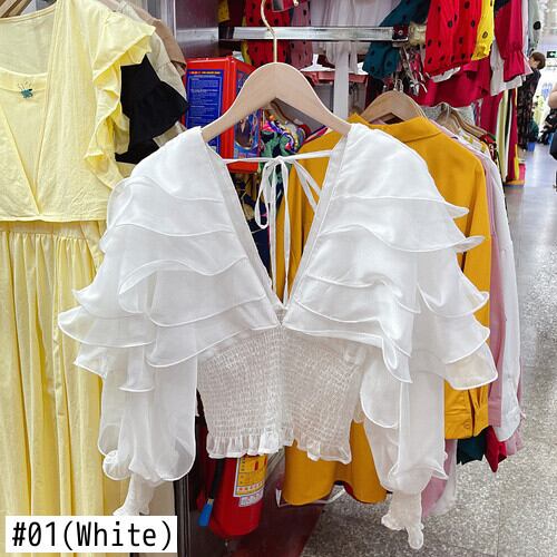 ノミクマレイヤードフリルレディースシフォンブラウスボウタイディープVネックシャツスリムウエストショート2022 リボン kor27619656486